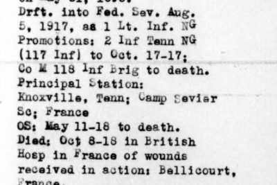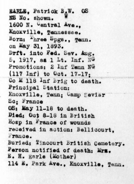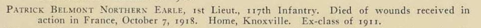 The family of the deceased has wired Washington for the confirmation of his death. Lieut. Earl joined the Third Tennessee militia about two years ago and saw active service on the Mexican border. Later he was transferred to the 118th Infantry. He was a graduate of the Knoxville High School and at the time of his enlistment was a student of the University of Tennessee.