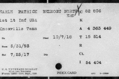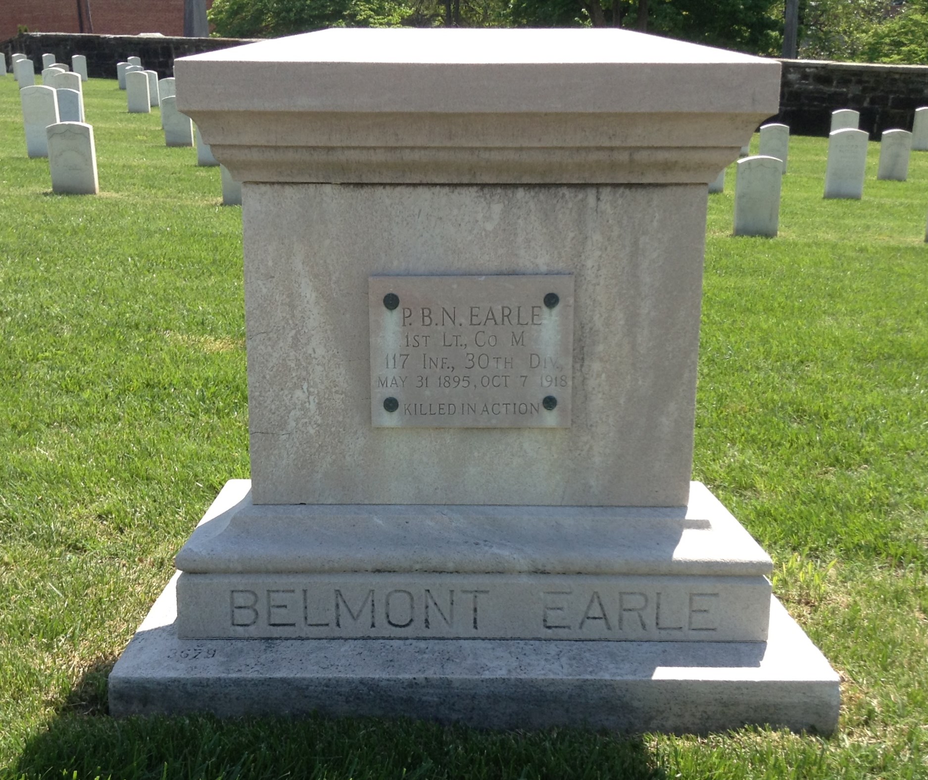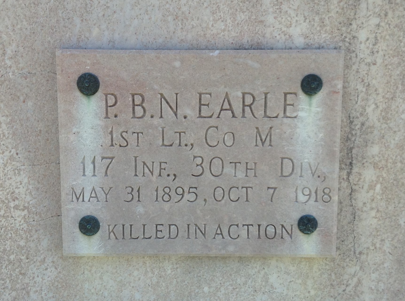He left Knoxville in September 1917 as an officer of Company D, 117th Infantry. At Camp Sevier, SC, he became an aide-de-camp of Gen. W. S. Scott, and when the latter was succeeded by General Tyson in command of the 59th Brigade, Lieutenant Earle remained on staff duty. However, after reaching France he asked assignment to line duty and was ordered to Company M, 118th Infantry. Took part in all engagements up to October 5, 1918, when he was fatally wounded near Bellicourt. He died October 7.