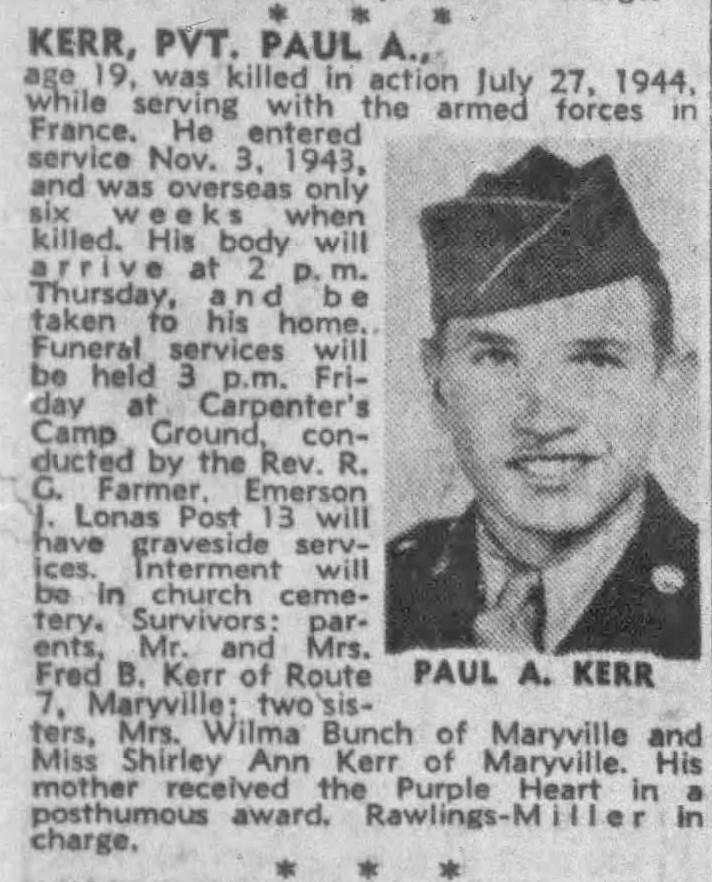 Pvt. Paul A. Kerr, age 19, was killed in action July 27, 1944, while serving with the armed forces in France. He entered service Nov. 3, 1943, and was overseas only six weeks when killed. His body will arrive Thursday, and be taken to his home. Funeral services will be held at Carpenter’s Camp Ground.