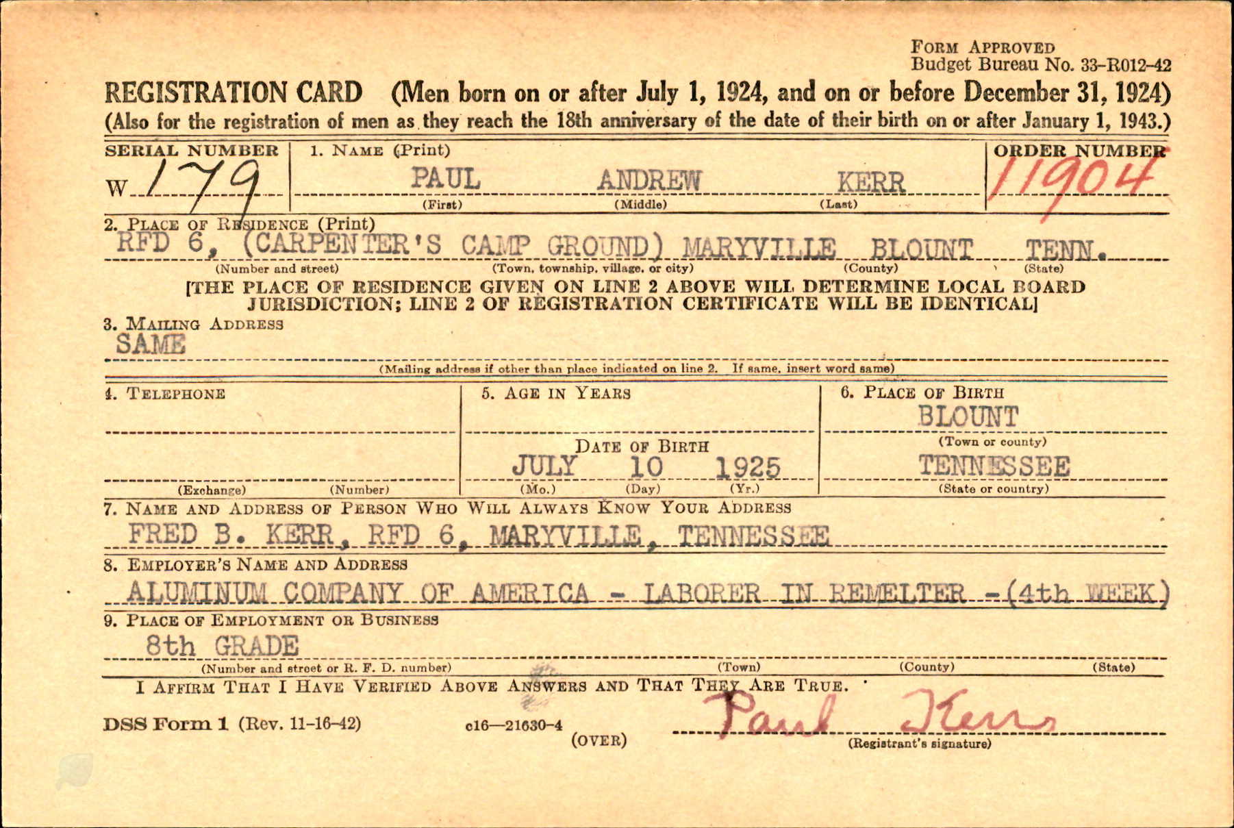 Paul Andrew Kerr was the son of Fredrick “Fred” Byrd Kerr and Mary May Carpenter.