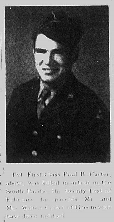 Private First Class Paul B. Carter, was killed in action in the South Pacific the twenty first of February his parents, Mr. and Mrs. Wilber Carter of Greeneville have been notified.