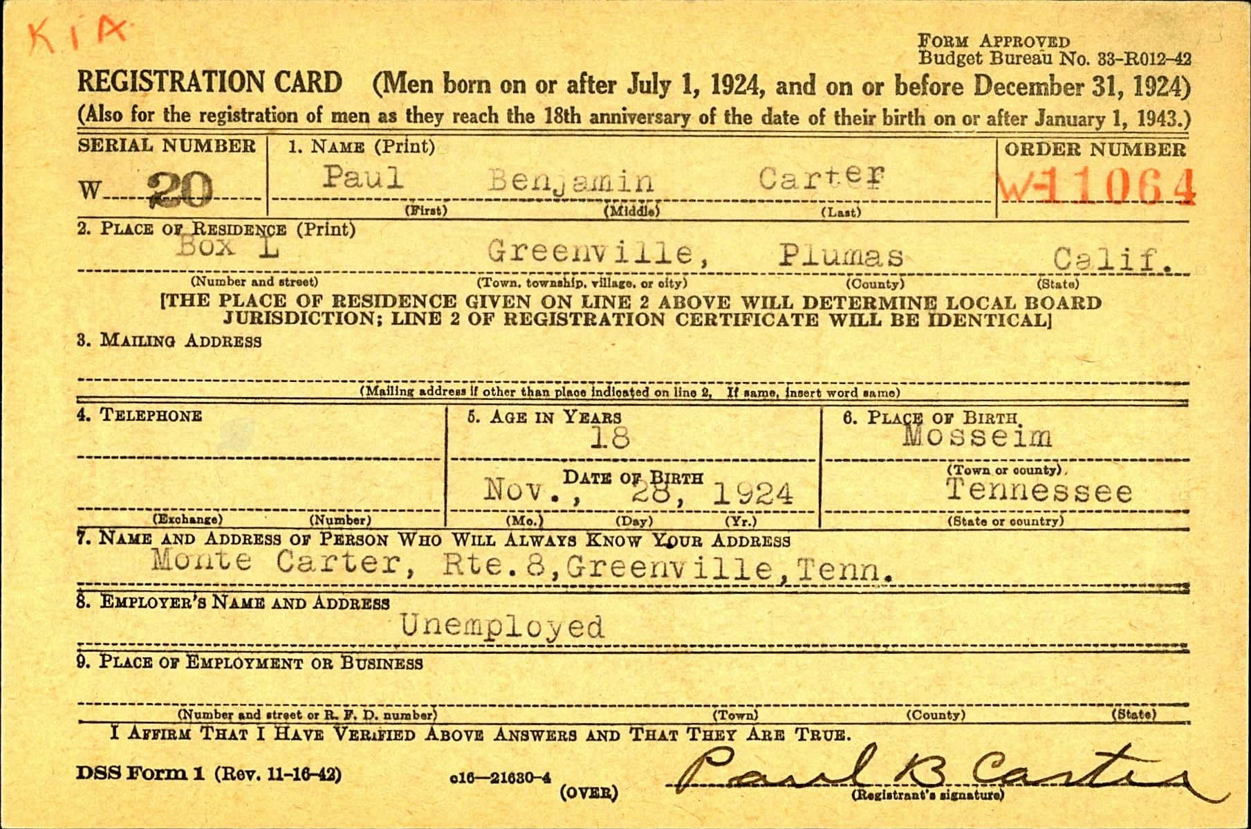 Paul Benjamin Carter was born in Mosseim, Tennessee. He lived at Plumas, California and enlisted on 2 April 1943 at Sacramento, California. He was killed in action.