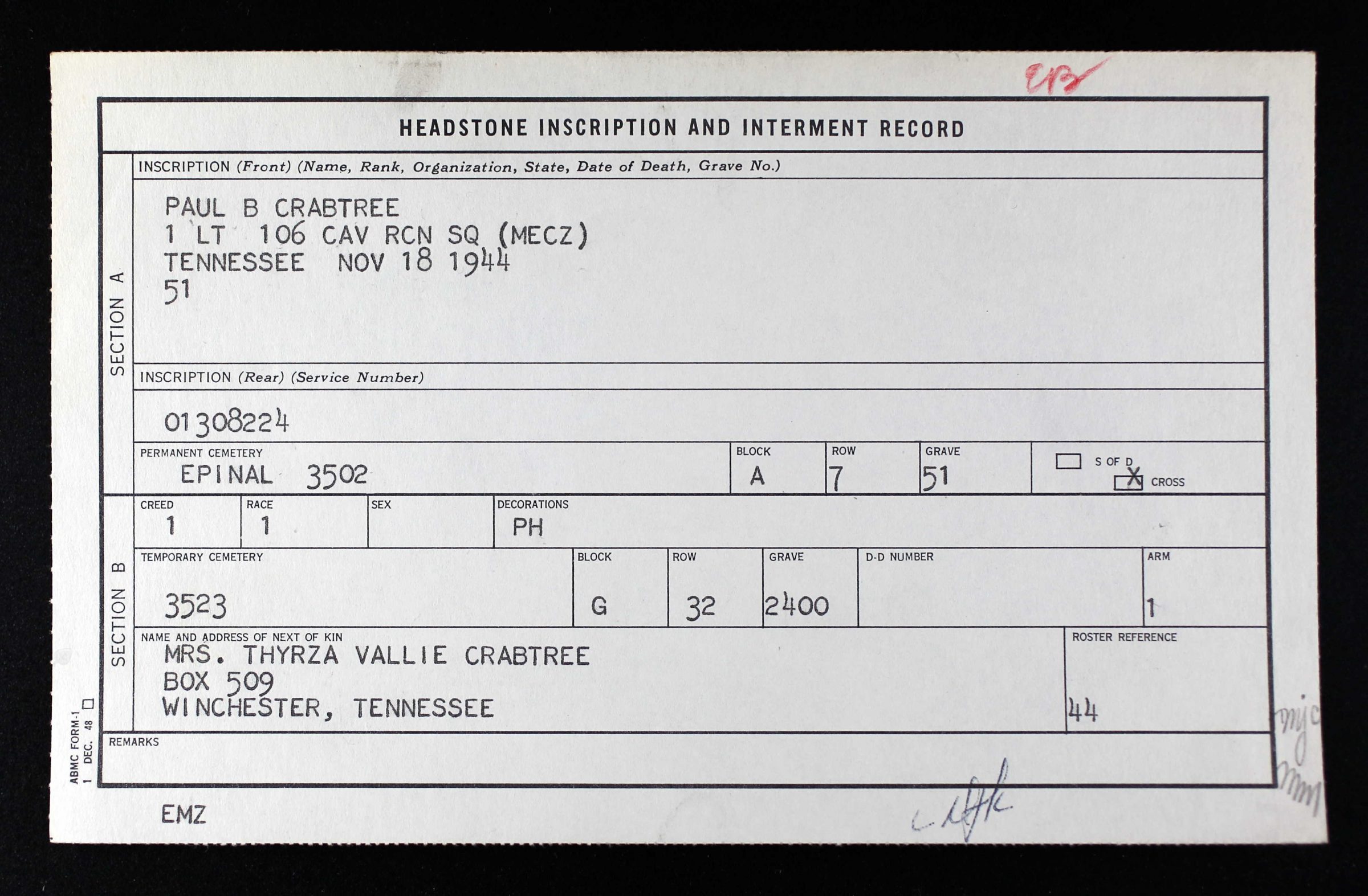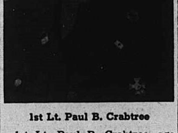 1st Lt. Paul B. Crabtree, age 29, was killed in action November 18, 1944. He had been in service eight years, having enlisted in October, 1936, leaving his studies at Berea College, Ky., to enlist. Prior to the declaration of the present war, he was stationed at Schofield Barracks, Hawaii. He is survived by his wife and small son, who reside at Winchester; his mothers, Mrs. Willie Kyker Gray, Pleasant Hill Route, Crossville; two sisters, Mrs. G.O. Woody and Mrs. J.L. Searing, of Route 2, Kingston; a brother, W.H. Crabtree of Elizabethton.