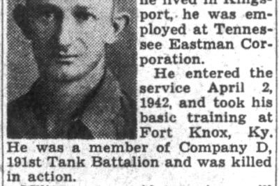 He entered the service April 2, 1942 and took his basic training at Fort Knox, Ky. He was a member of Company D, 191st Tank Battalion and was killed in action.