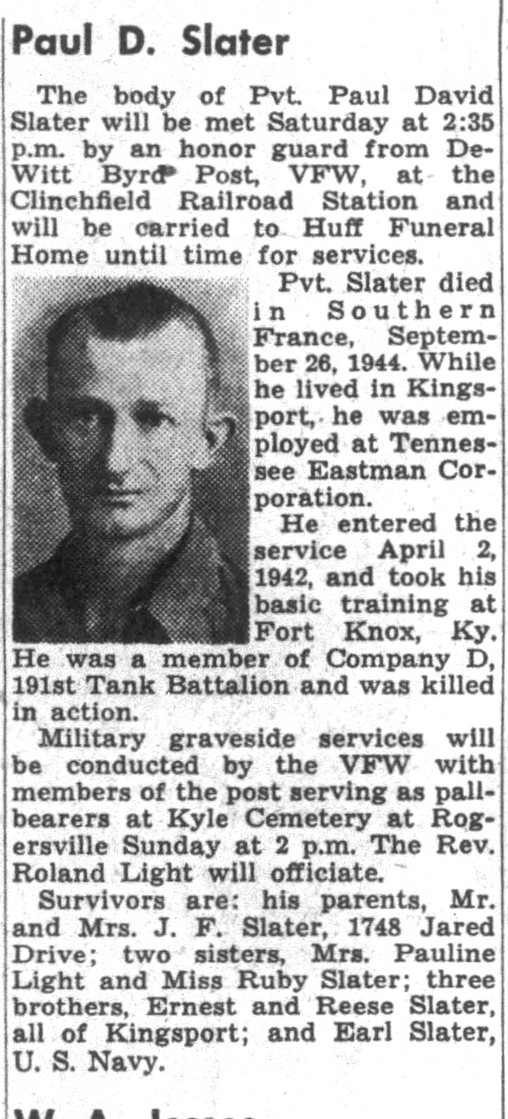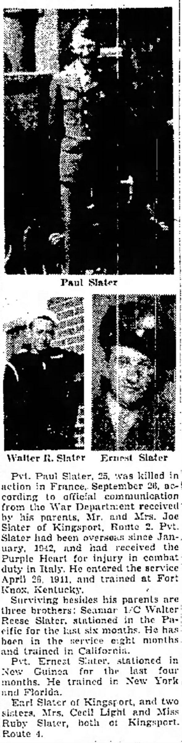 Pvt. Paul Slater, 25, was killed in action in France, September 26, 1944, according to official communication from the War Department received by his parents, Mr. and Mrs. Joe Slater of Kingsport, Route 2. Pvt Slater had been overseas since January 1942, and had received the Purple Heart for injury in combat in Italy. He entered the service April 26, 1941, and trained at Fort Knox, Kentucky. Surviving besides his parents are three brothers: Seamar 1/C Walter Reese Slater, stationed in the Pacific for the last six months. He has been in the service eight months and trained in California. Pvt Ernest Slater, stationed in New Guinea for the last four months. He trained in New York and Florida.
