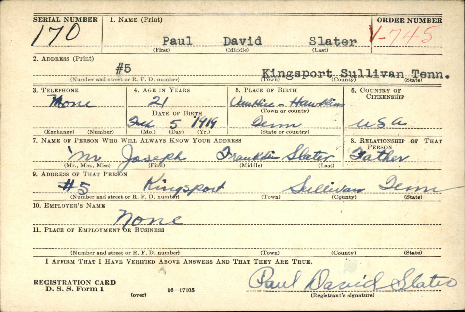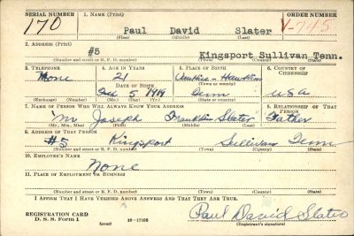 Paul David Slater was born on 15 February 1919 in Hawkins County, Tennessee. Son of Joseph Franklin Slater and Myrtle Leona Kite