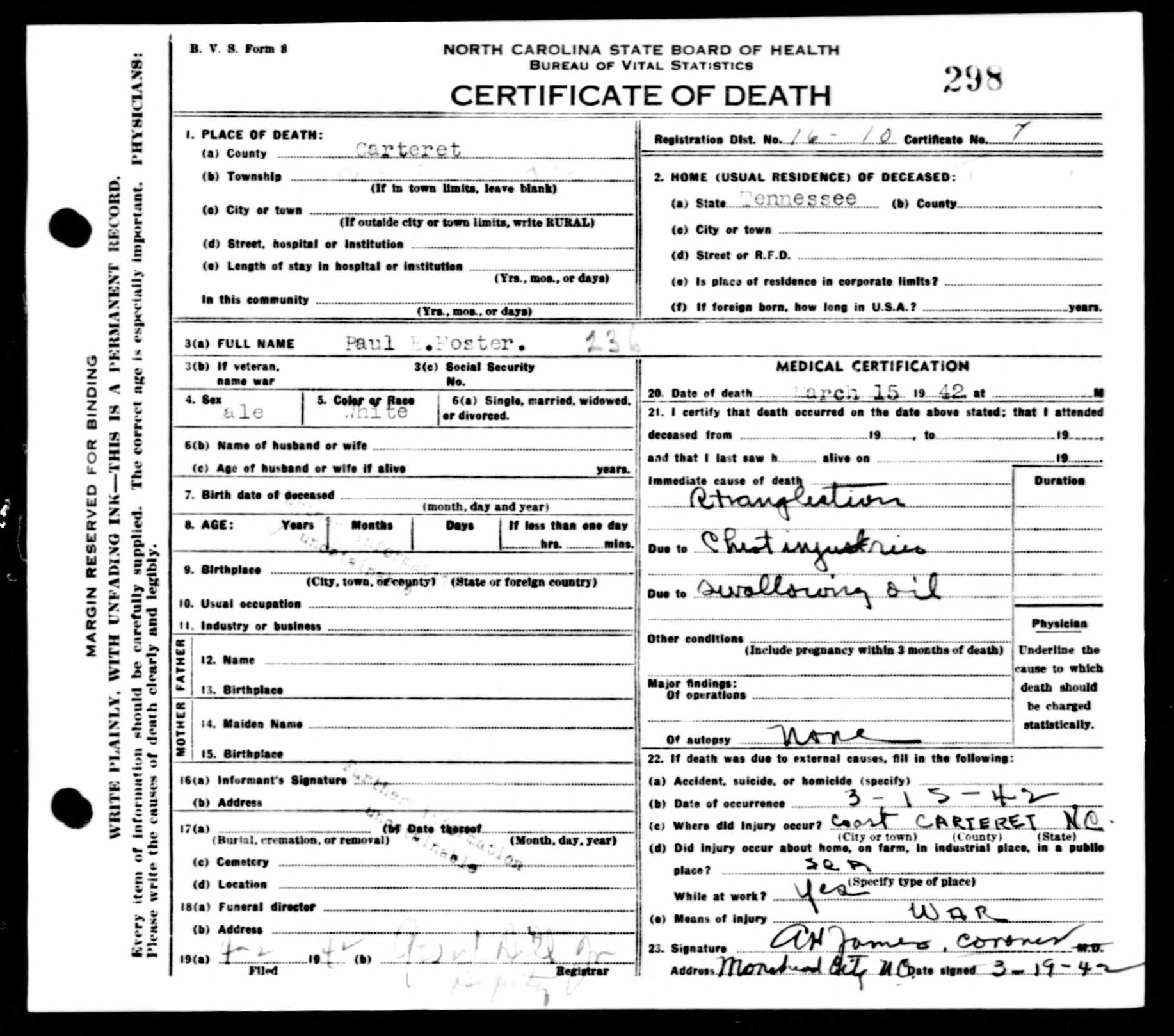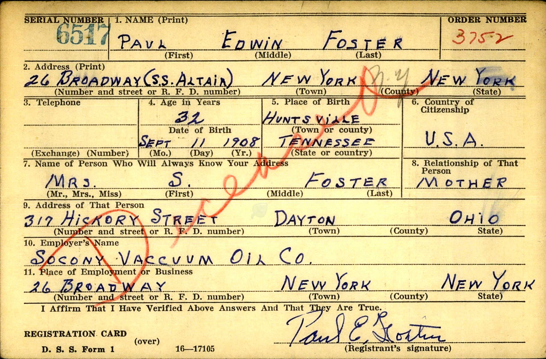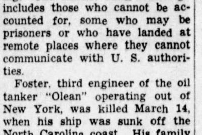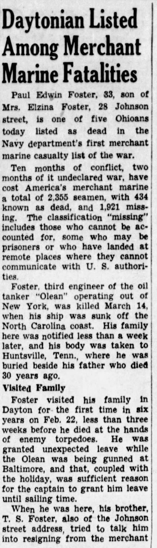 Paul Edwin Foster, 33, son of Mrs. Elzina Foster, 28 Johnson street, is one of five Ohioans today listed as dead in the Navy department’s first merchant marine casualty list of the war. Ten months of conflict, two months of it undeclared war, have cost America’s merchant marine a total of 2.355 seamen, with 434 known as dead, and 1,921 missing. The classification “missing”includes those who may be prisoner or who have landed at remote places where they cannot communicate with U.S. authorities. Foster, third engineer of the oil tanker “Olean” operating out of New York, was killed March 14, when his ship was sunk off the North Carolina coast. His family here was notified less than a week later, and his body was taken to Huntsville, Tenn., where he was buried beside his father who died 30 years ago.