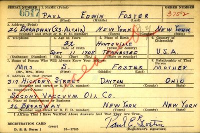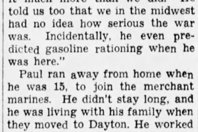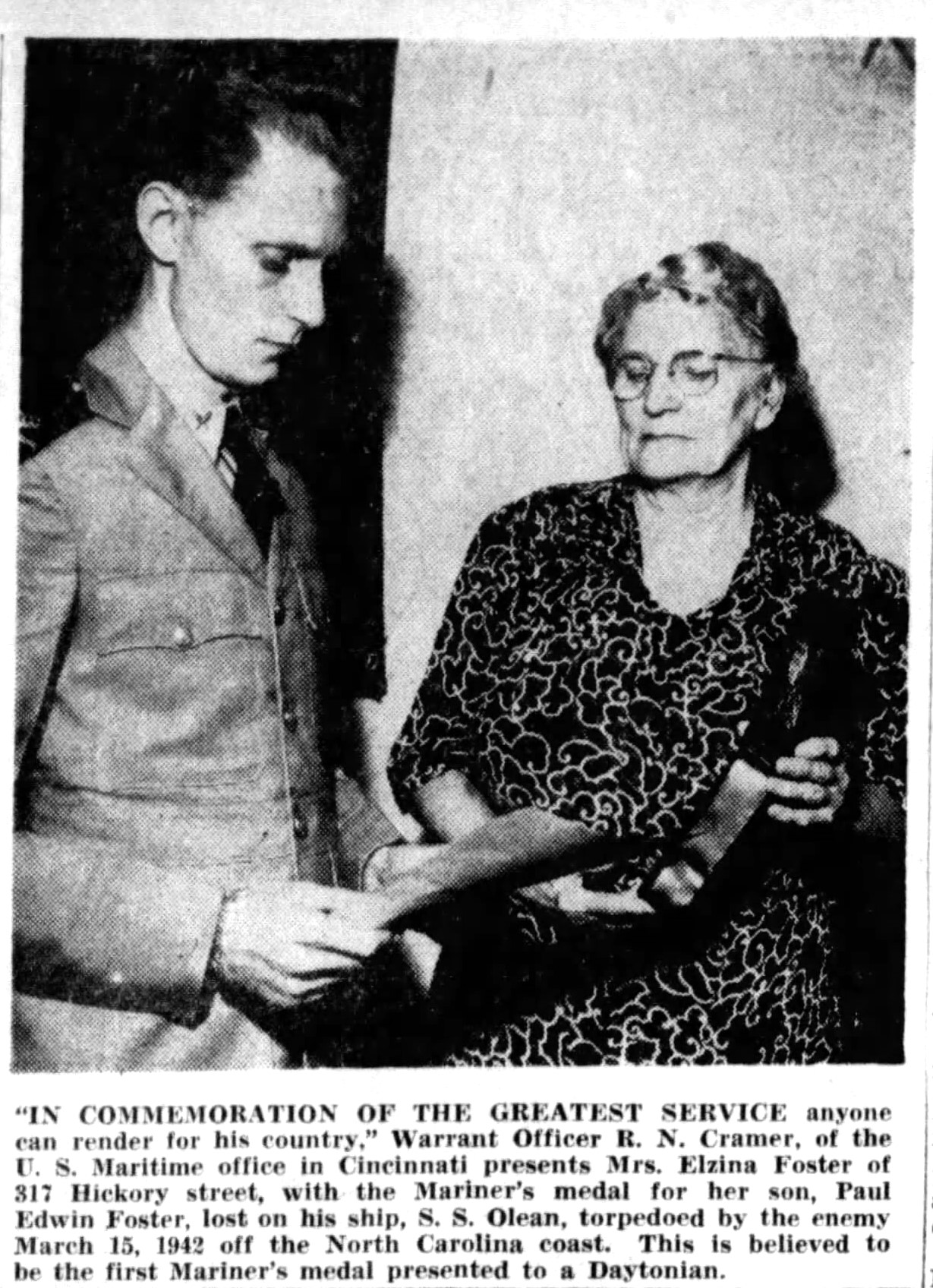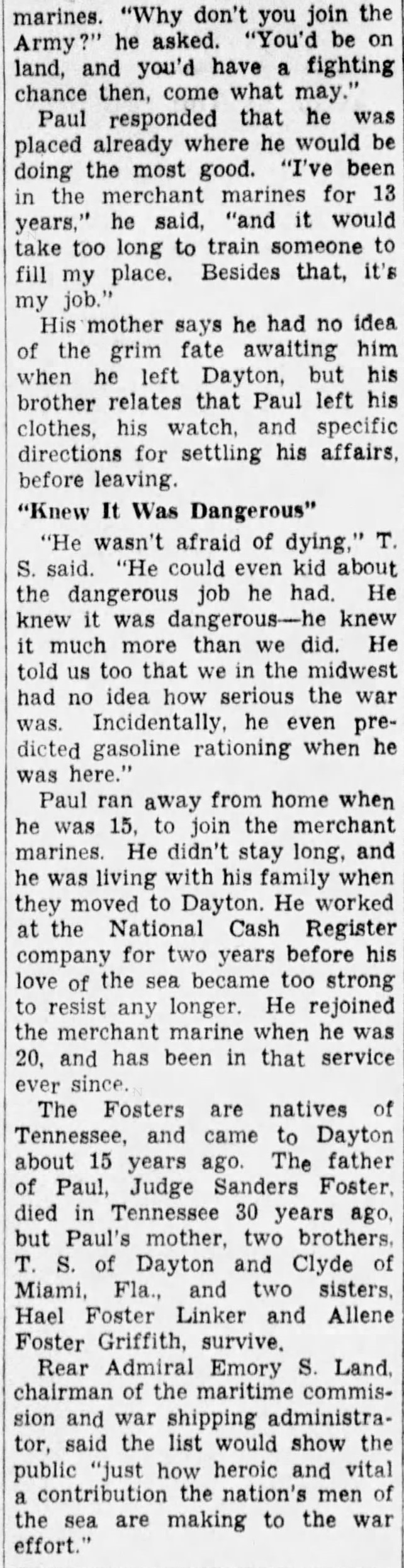 Foster visisted his family in Dayton for the first time in six years on Feb. 22, less than three weeks before he died at the hands of enemy torpedoes. He was granted unexpected leave while the Olean was being gunned at Baltimore, and that, coupled with the holiday, was sufficient reason for the captain to grant him leave until sailing time. When he was here, his brother, T.S. Foster, also of the Johnson street address, tried to talk him into resigning from the merchant marines. “Why don’t you join the Army?” he asked. “You’d be on land, and you’d have a fighting chance then, come what may.” Paul responded that he was placed already where he would be doing the most good. “I’ve been in the merchant marines for 13 years,” he said, “and it would take too long to train someone to fill my place. Besides that, it’s my job.” His mother says he had no idea of the grim fate awaiting him when he left Dayton, but his brother relates that Paul left his clothes, his watch and specific directions for setting his affairs, before leaving. “He wasn’t afraid of dying, ”T.S. said. “He could even kid about the dangerous job he had. He knew it was dangerous – he knew it much more than we did. He told us too that we in the Midwest had no idea how serious the war was. Incidentally, he even predicted gasoline rationing when he was here.” Paul ran away from home when he was 15, to join the merchant marines. He didn’t stay long, and he was living with his family when they moved to Dayton. He worked at the National Cash Register company for two years before his love of the sea became too strong to resist any longer. He rejoined the merchant marine when he was 20, and has been in that service ever since. The Fosters are natives of Tennessee, and came to Dayton about 15 years ago. The father of Paul, Judge Sanders Foster, died in Tennessee 30 years ago, but Paul’s mother, two brothers, T.S. of Dayton and Clyde of Miami, Fla., and two sisters, Hael Foster Linker and Allene Foster Griffith, survive. Rear Admiral Emory S. Land, chairman of the maritime commission and war shipping administrator, said the list would show the public “just how heroic and vital a contribution the nation’s men of the sea are making to the war effort.”