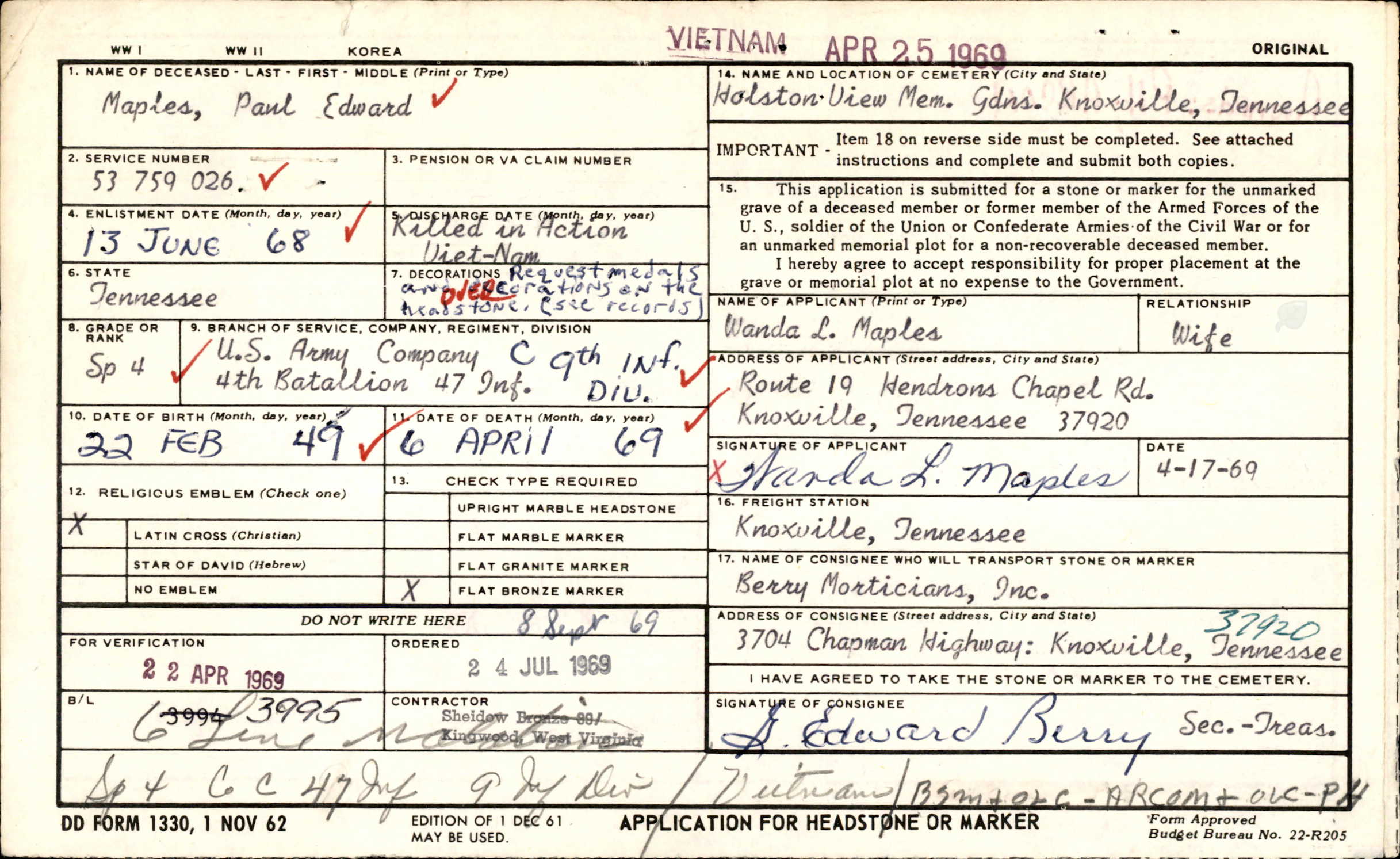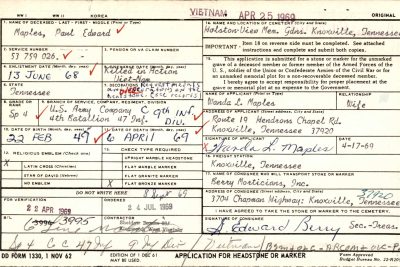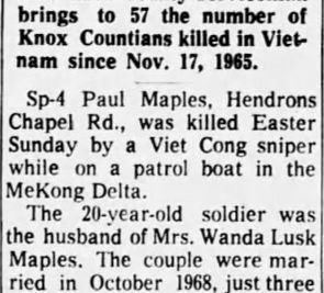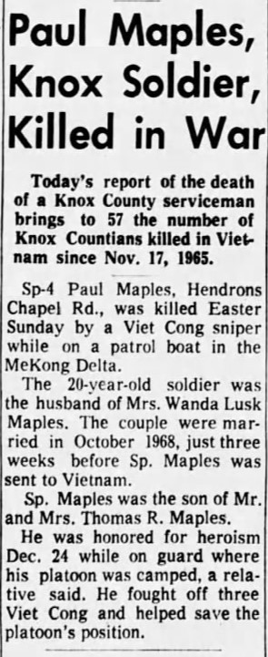 Burial in Highland South Cemetery. Paul Edward Maples, age 20, Hendrons Chapel Road, was killed in action in Mekong, South Vietnam, April 6, 1969. He graduated from Young High School in 1967. He was employed by Kroger Company, Chapman Highway, and a member of Valley Grove Baptist Church.