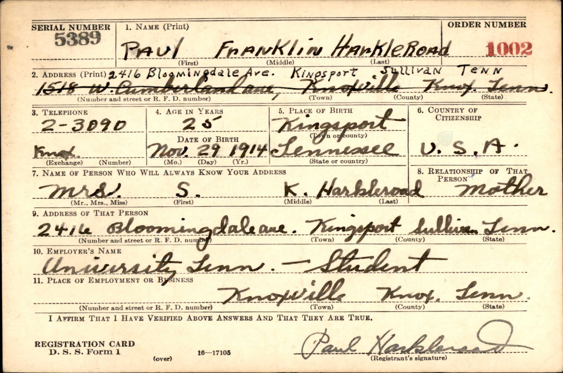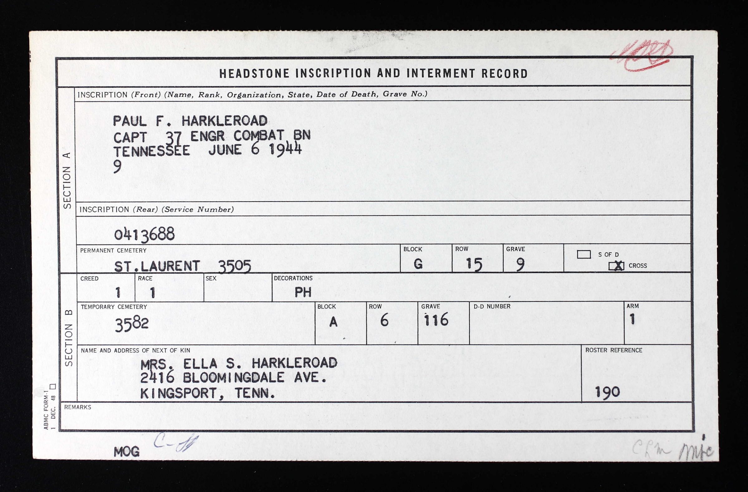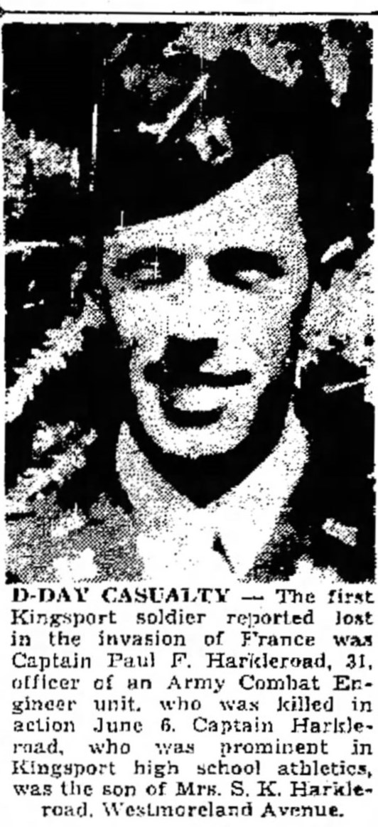 Paul Franklin Harkleroad. Age 30. Volunteered U.S. Army on June 8, 1941. Killed in Action in the Invasion of France on June 6, 1944. Graduated from University of Tennessee, School of Engineering. Member of Glenwood Baptist Church. Son of Mrs. S. K. Harkleroad, 2416 Bloomingdale Ave., Kingport, TN.