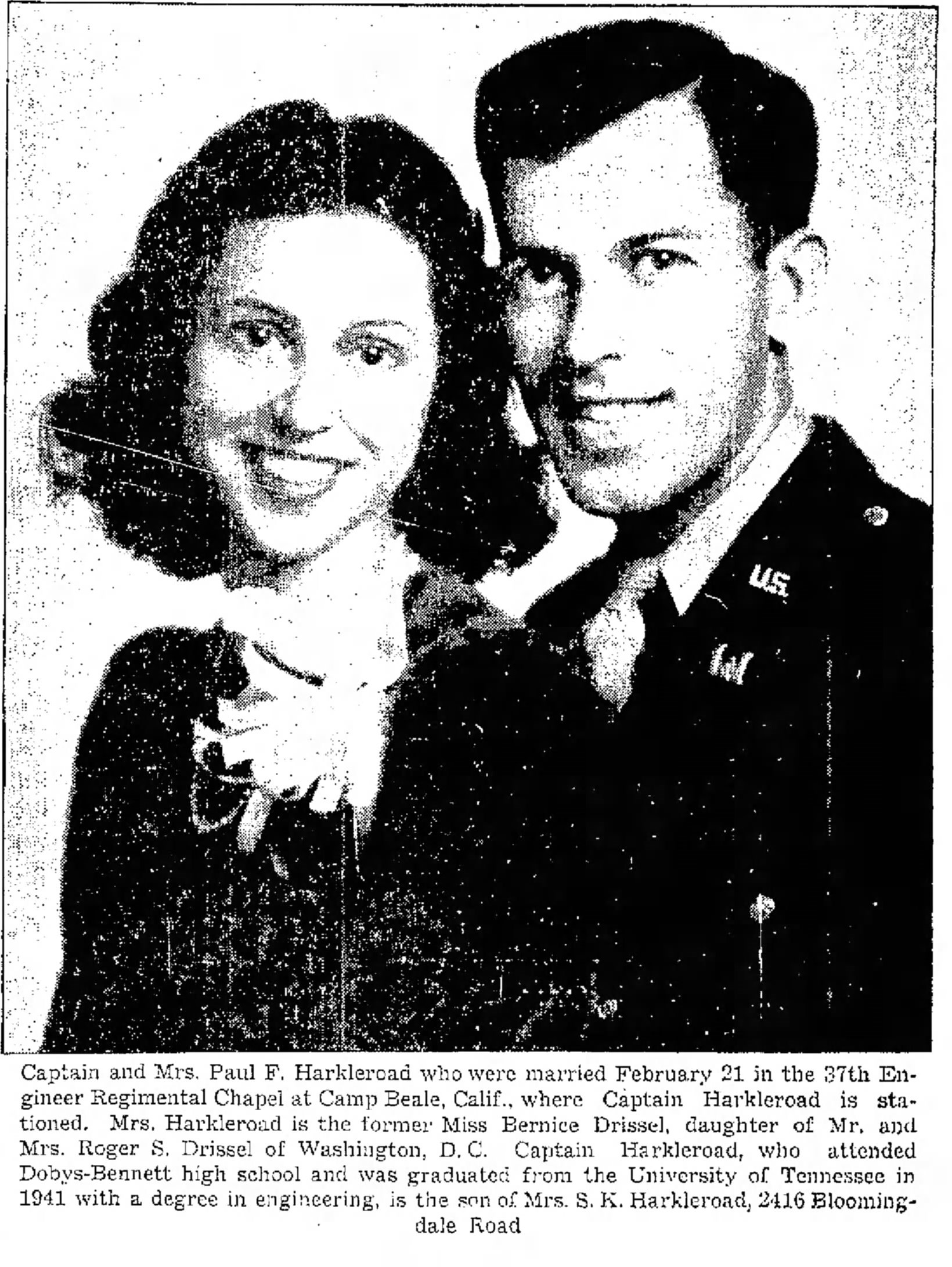 Paul Harkleroad married my aunt Mabel Bernice Drissel. She always used her middle name of Bernice or Bea. (Note: this is the correct spelling of her last name). She is still living as of 6 June 2014. She remarried several years after Paul’s death and was widowed again.