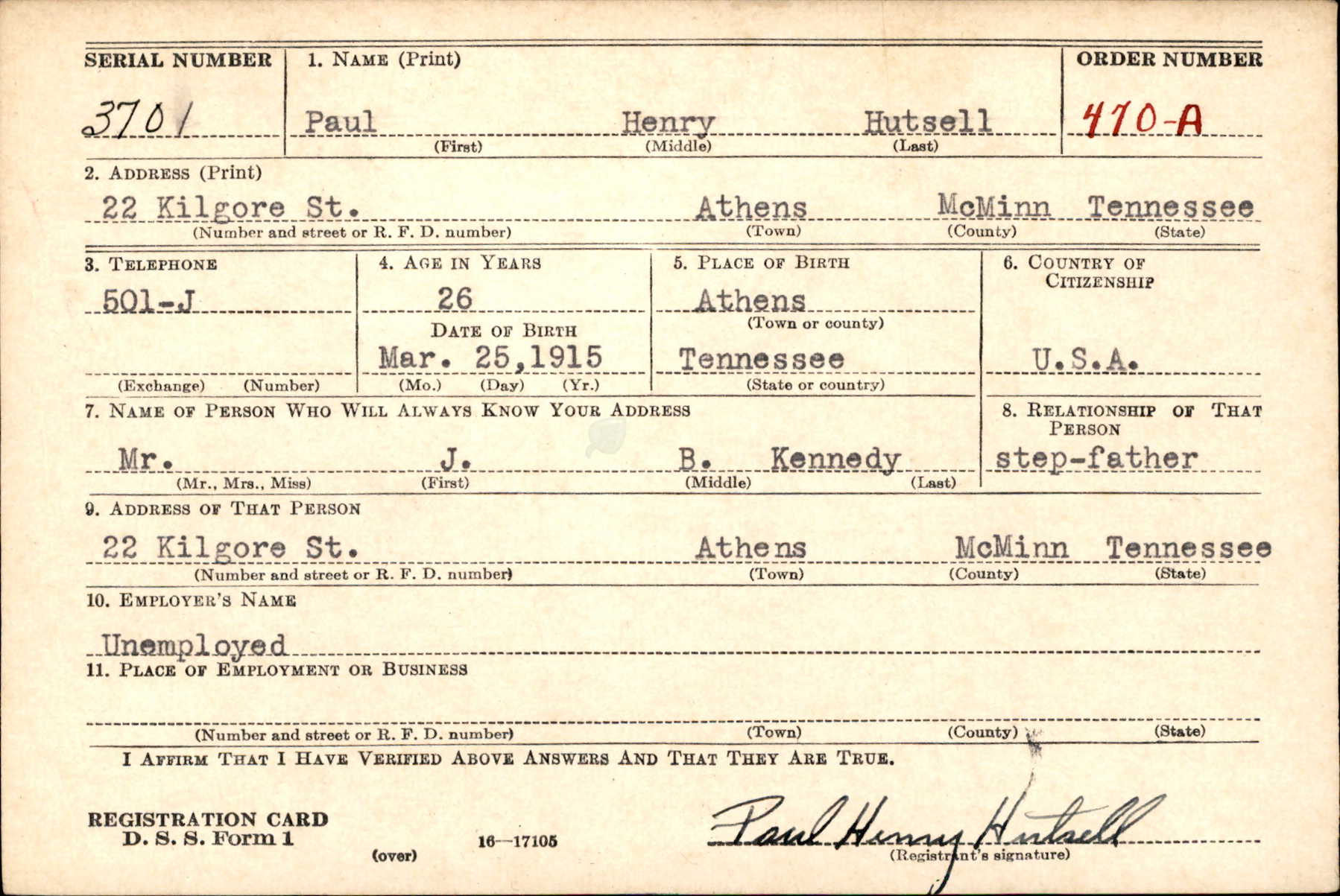 Paul Henry Hutsell was born on 25 March 1915 in Athens, Tennessee. He was the son of Henry Clay Hutsell and Oma Simpson. He attended McMinn County High School and Tennessee Wesleyan College .
