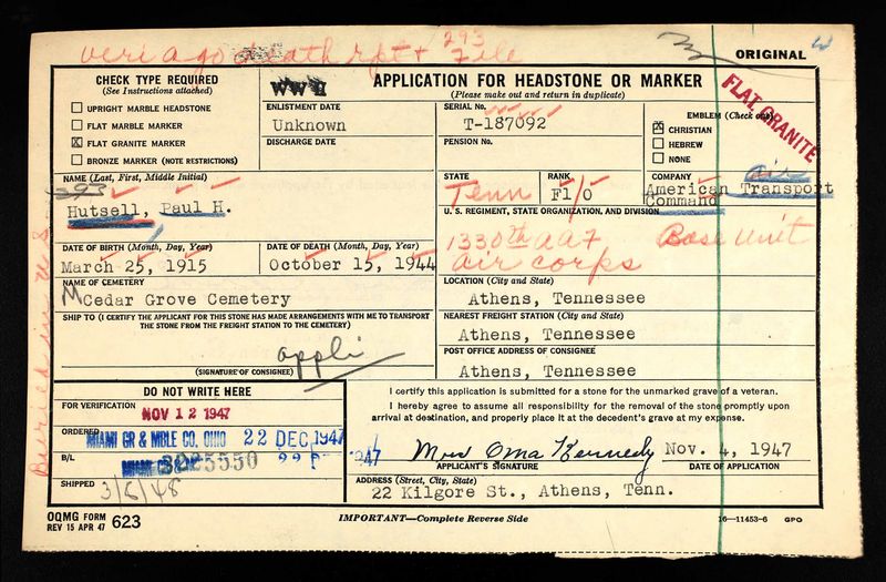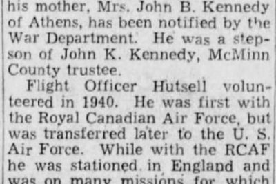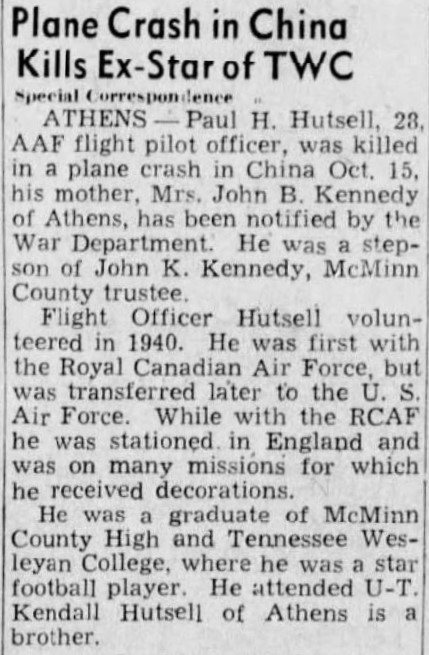 Paul H. Hutsell, 28, AAF flight pilot officer, was killed in a plane crash in China Oct. 15, his mother, Mrs. John B. Kennedy of Athens, has been notified by the War Department. He was a stepson of John K. Kennedy, McMinn County Trustee. Flight Officer Hutsell volunteered in 1940. He was first with the Royal Canadian Air Force, but was transferred later to the U.S. Air Force. While with the RCAF he was stationed in England and was on many missions for which he received decorations. He was a graduate of McMinn County High and Tennessee Wesleyan College, where he was a star football player. He attended U-T. Kendall Hutsell of Athens is a brother.
