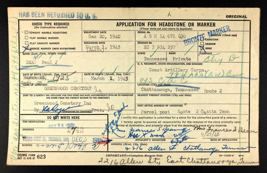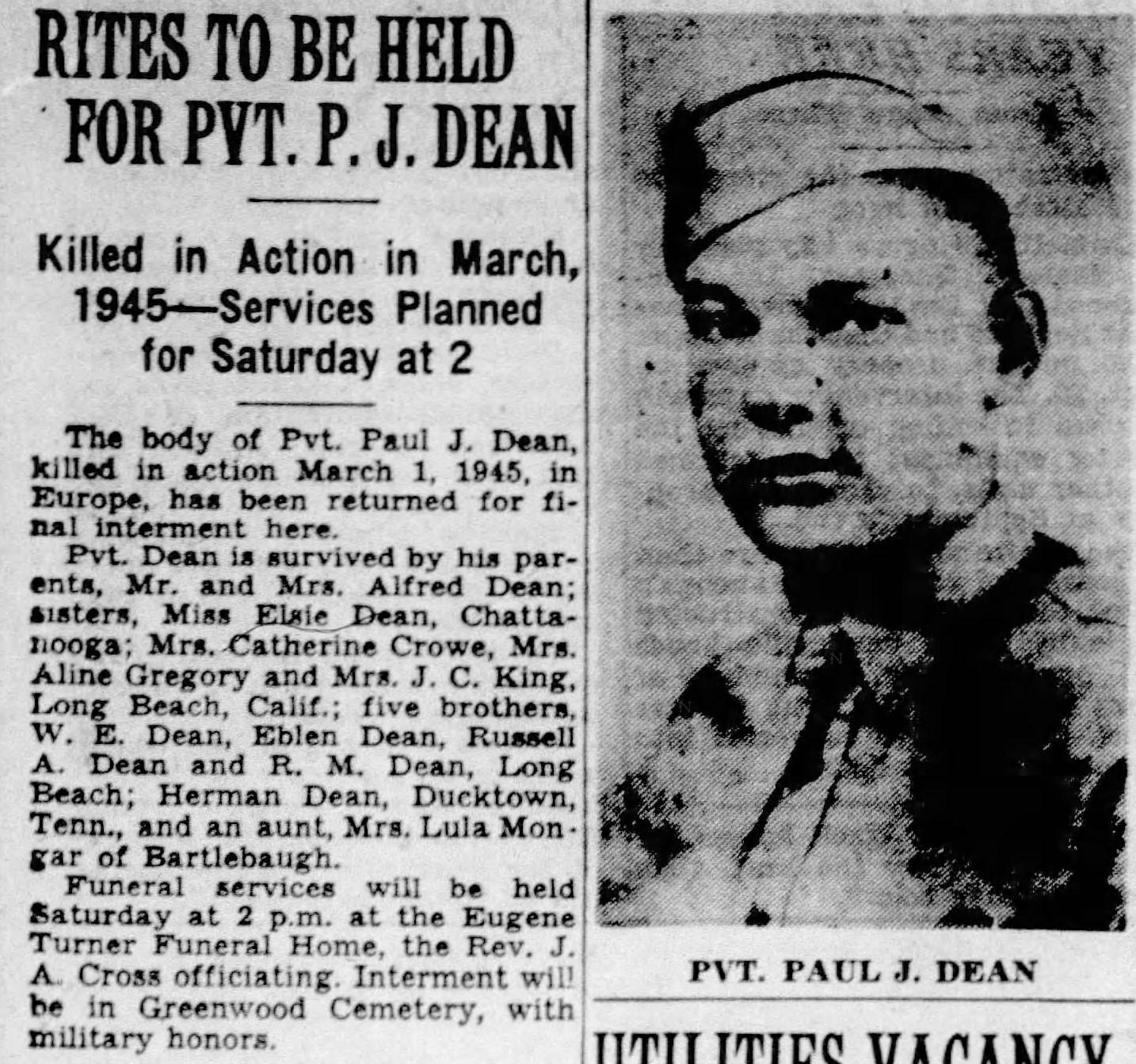 The body of Pvt. Paul J. Dean, killed in action March 1, 1945, in Europe, has been returned for final interment here. Pvt. Dean is survived by his parents, Mr. and Mrs. Alfred Dean; sister, Miss Elsie Dean, Chattanooga, Mrs. Catherine Crowe, Mrs. Aline Gregory and Mrs. J.C. King, Long Beach, Calif.; five borthers, W.E. Dean, Eblen Dean, Russell A. Dean and R.M. Dean. Long Beach; Herman Dean, Ducktown, Tenn., and an aunt, Mrs. Lula Mongar of Bartlebaugh.