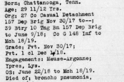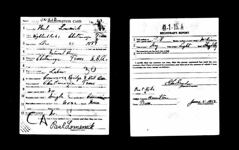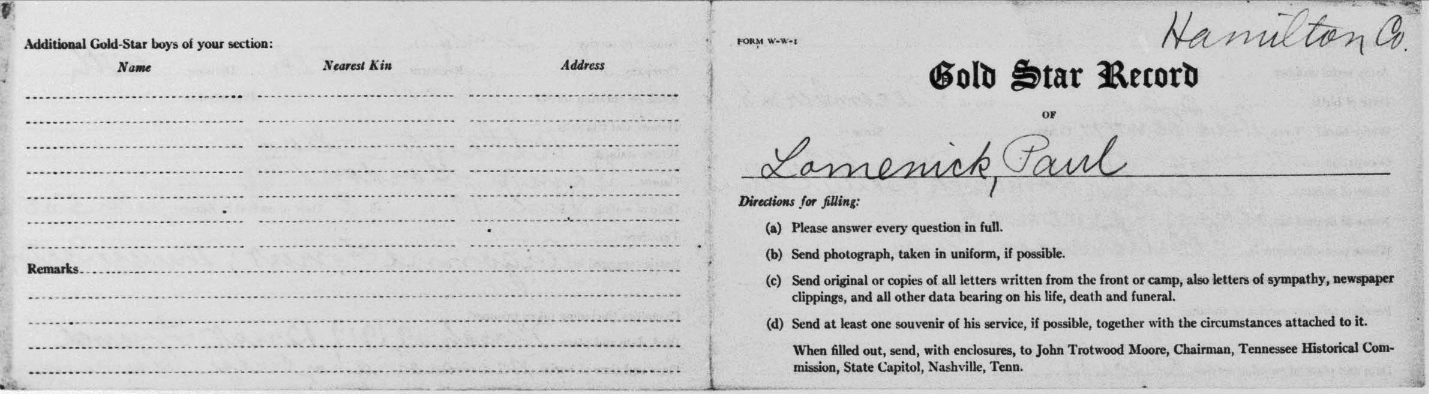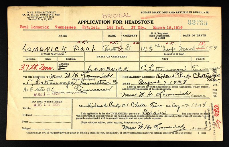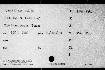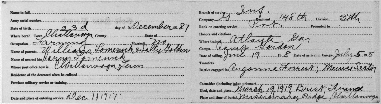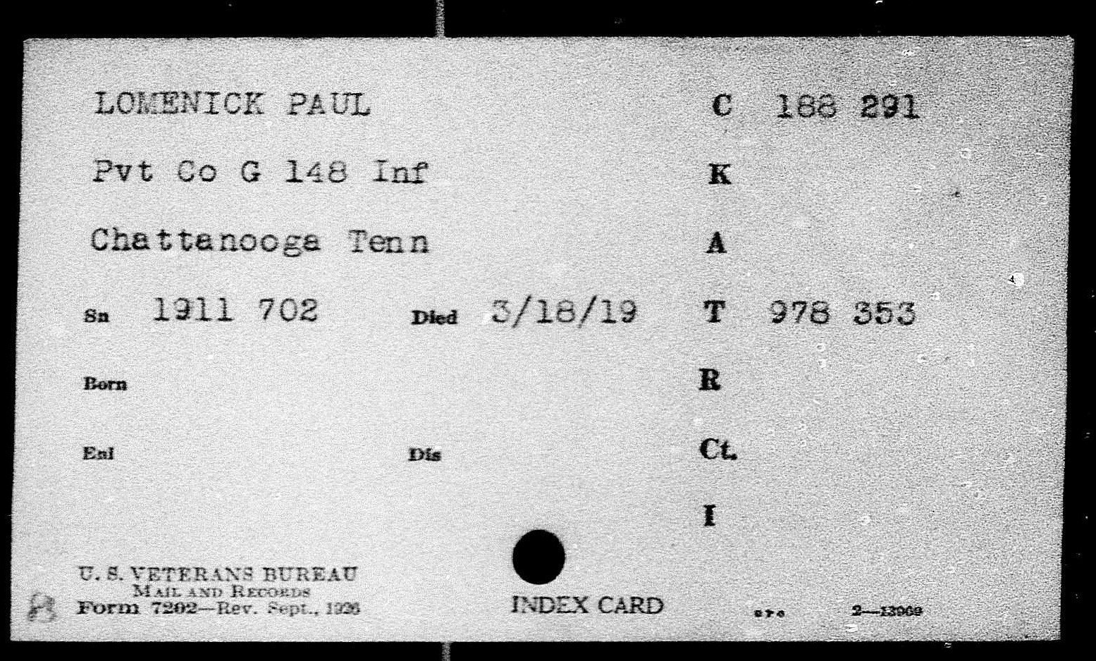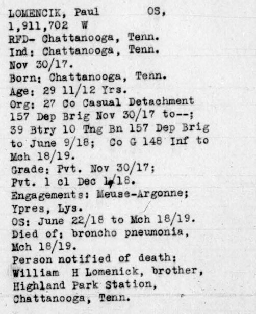 Paul Lomenick was born on 23 December 1887, Chattanooga, Tennessee. He entered the service at Chattanooga on 30 November 1917. Pfc Lomenick died 18 March 1919 at Brest in France of broncho pneumonia.