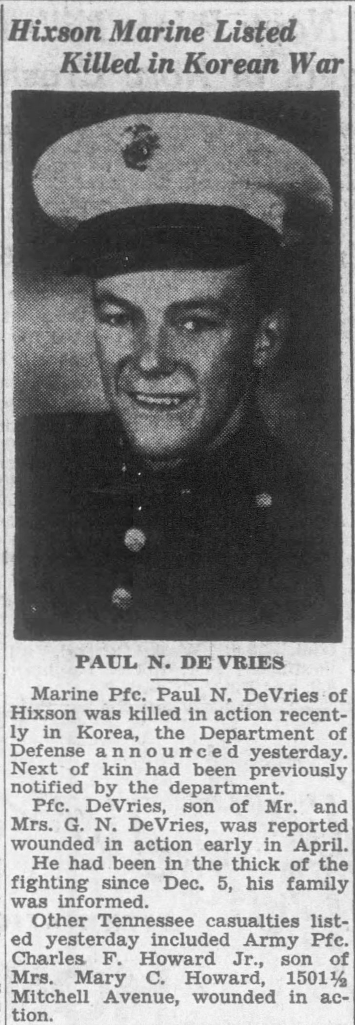 Marine Pfc. Paul N. DeVries of Hixson was killed in action recently in Korea, the Department of Defense announce yesterday. Next of kin had been previously notified by the department. Pfc. DeVries, son of Mr. and Mrs. G.N. DeVries, was reported wounded in action early in April. He had been in the thick of the fighting since Dec. 5, his family was informed.