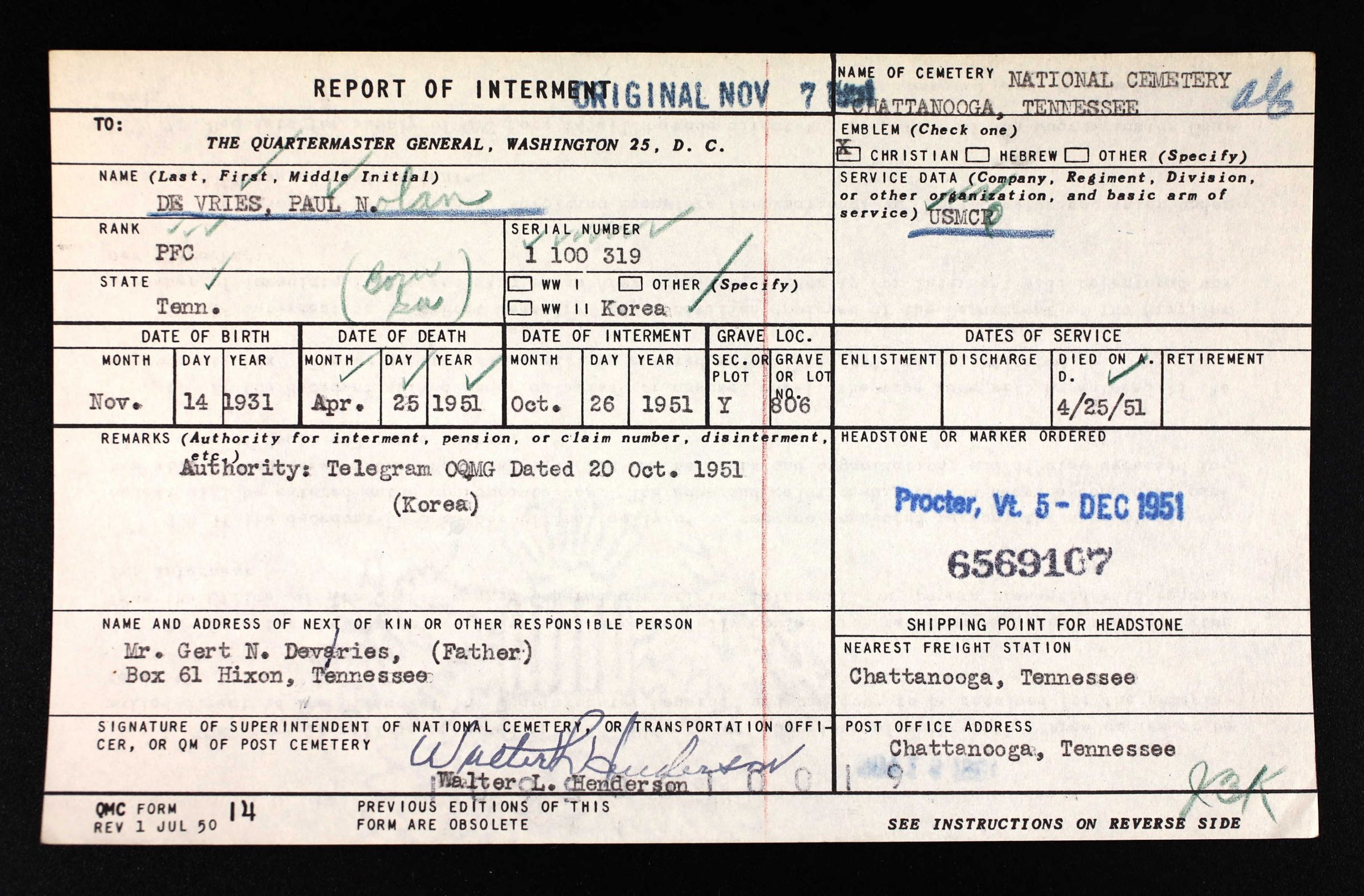 Private First Class Paul Nolan De Vries was a member of Weapons Company, 3rd Battalion, 1st Marines, 1st Marine Division. He was killed in action while fighting the enemy in Korea.