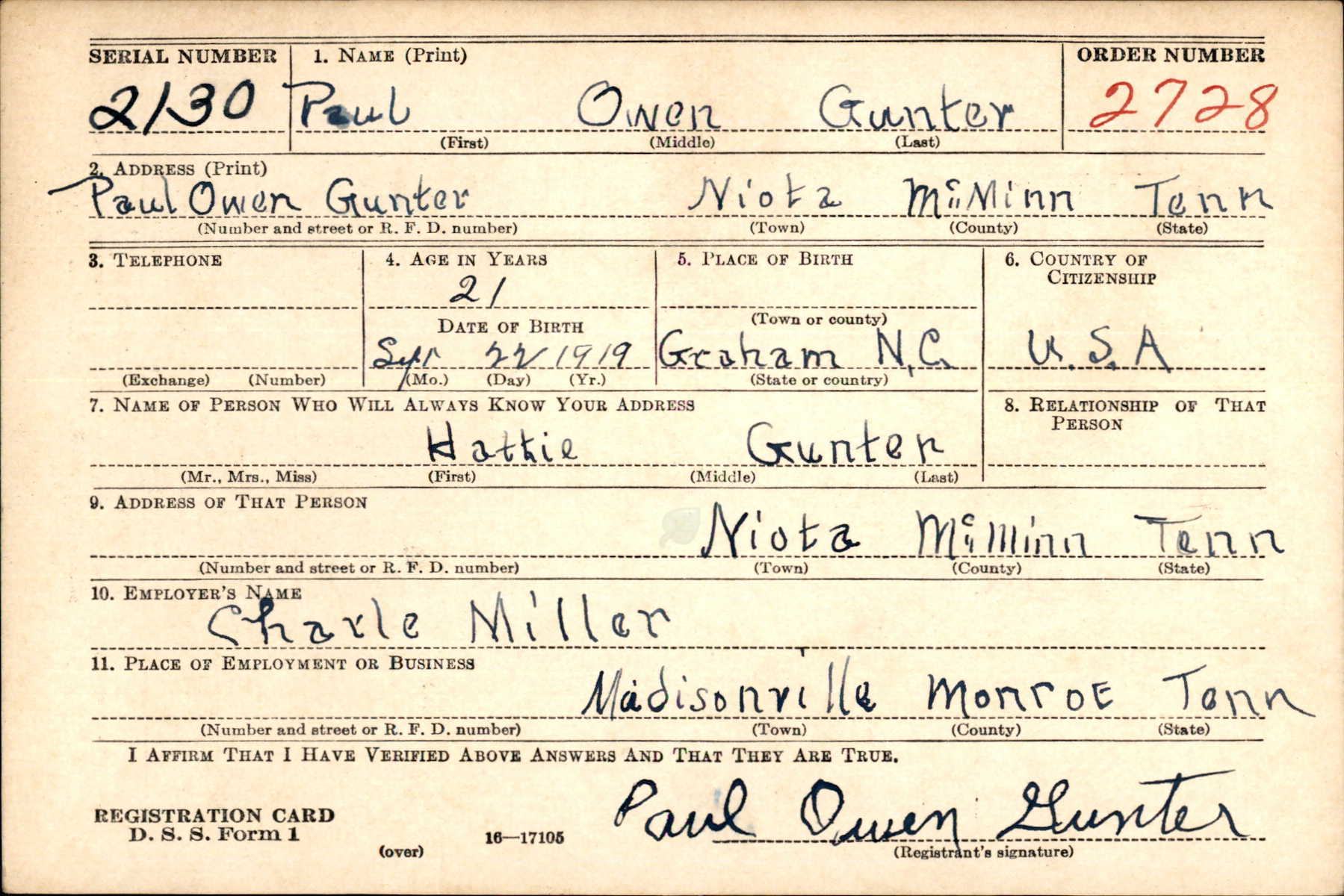 Paul Owen Guner was born on September 22, 1919, Stechoah, NC., the son of Commodore Columbus Gunter and Parma “Parmy” Crisp.