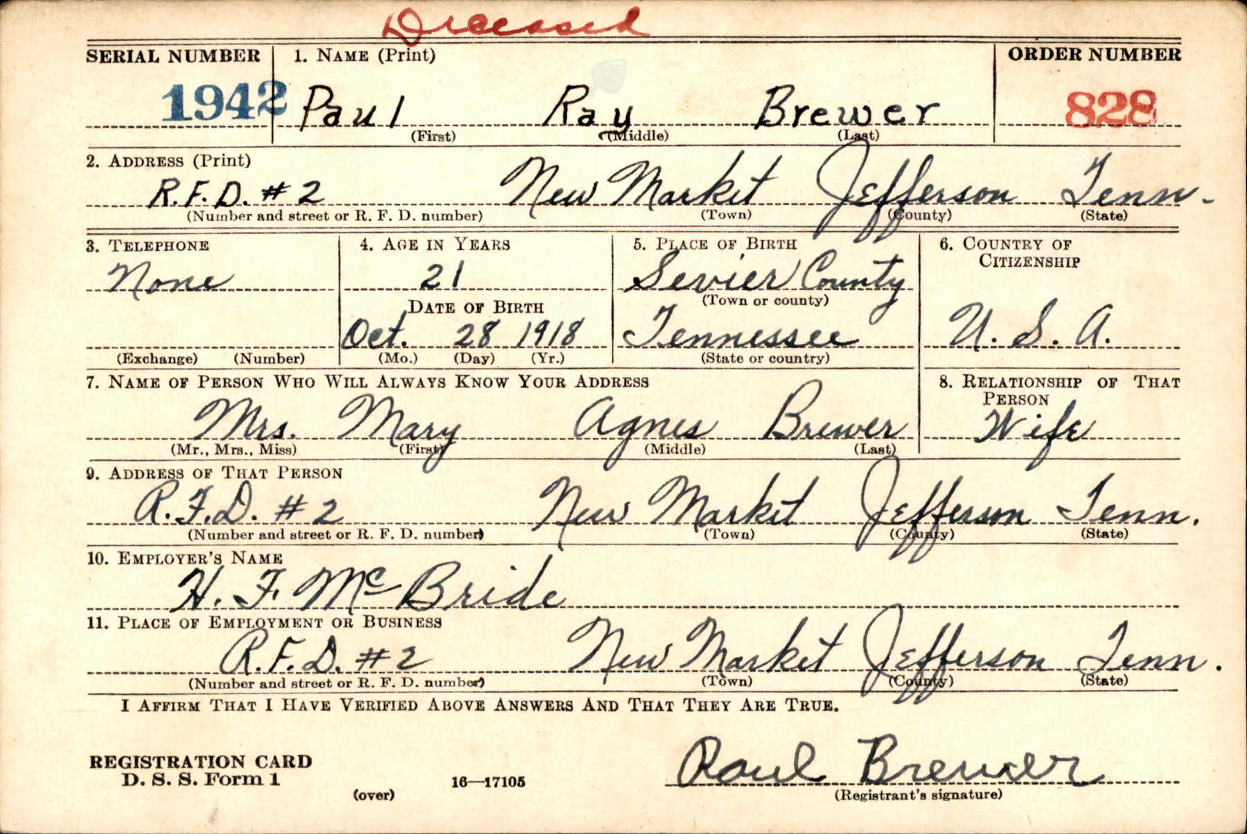 Paul Ray Brewer was born in Sevier County, Tennessee, the son of Frank Ross Brewer and Maggie Owens. Husband of Mary Agnes Stellard and father of Barbara Jean Brewer and Paul Ray Brewer Jr.