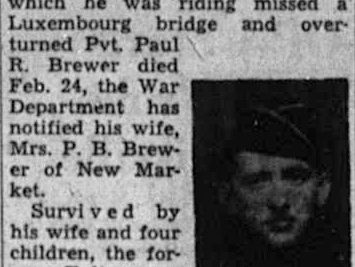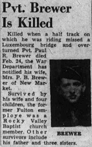 Killed when a half track on which he was riding missed a Luxembourg bridge and overturned Pvt. Paul R. Brewer died Feb. 24, the War Department has notified his wife, Mrs. P.B. Brewer of New Market.