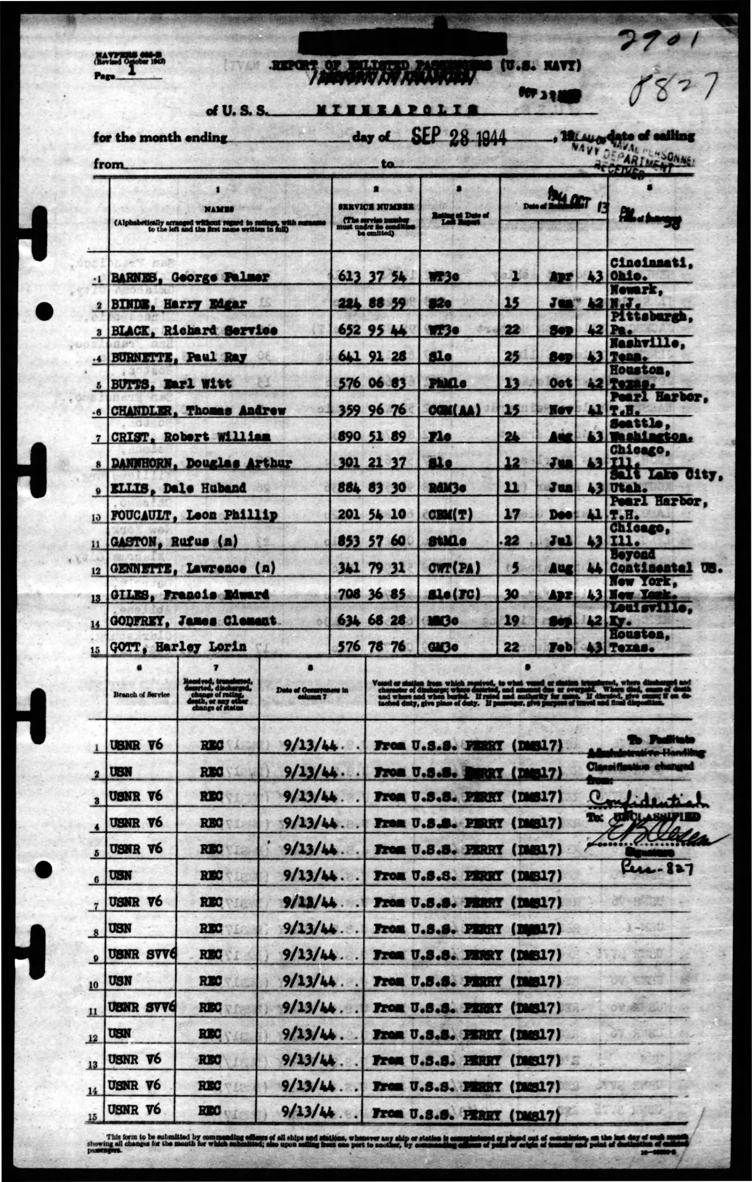 Burnette served on the U.S.S. Perry (DMS17) and was transferred to the U.S.S. Minneapolis (CA36) on 13 September 1944.