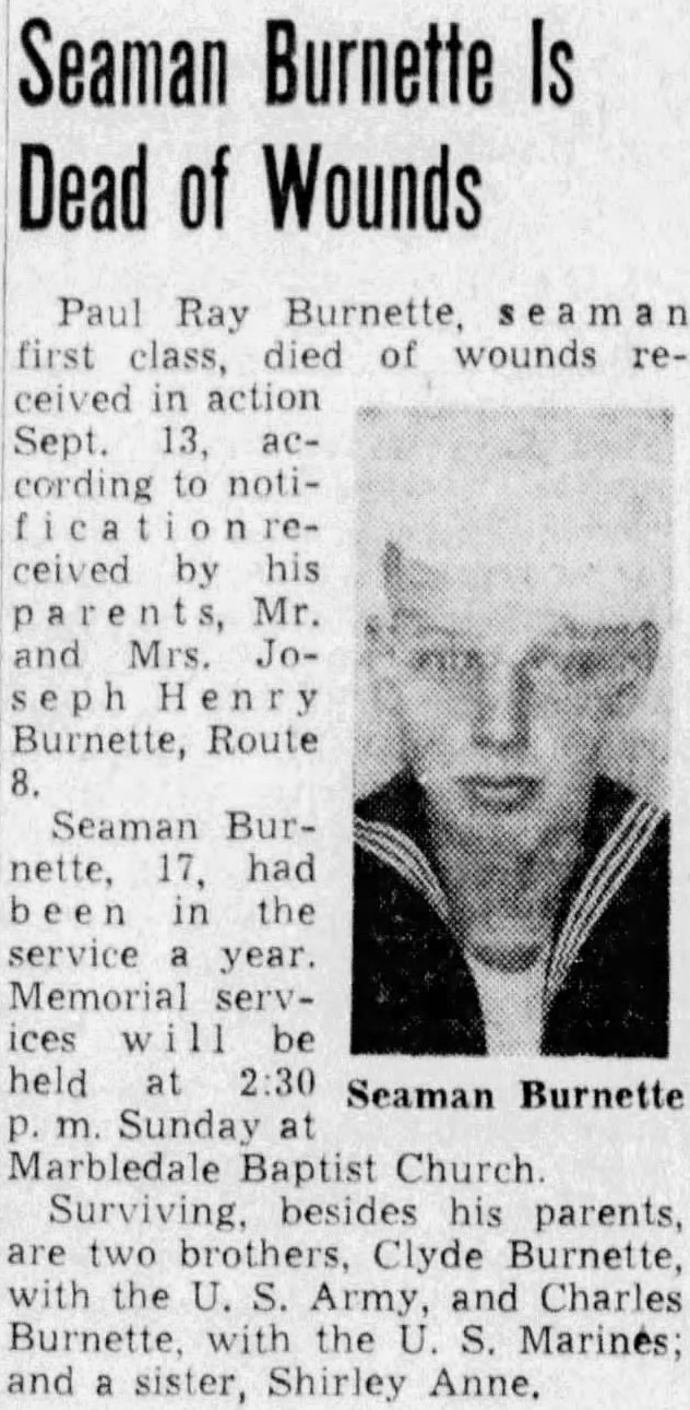 Paul Ray Burnette, seaman first class, died of wounds received in action Sept. 13, according to notification received by his parents, Mr. and Mrs. Joseph Henry Burnette, Route 8.