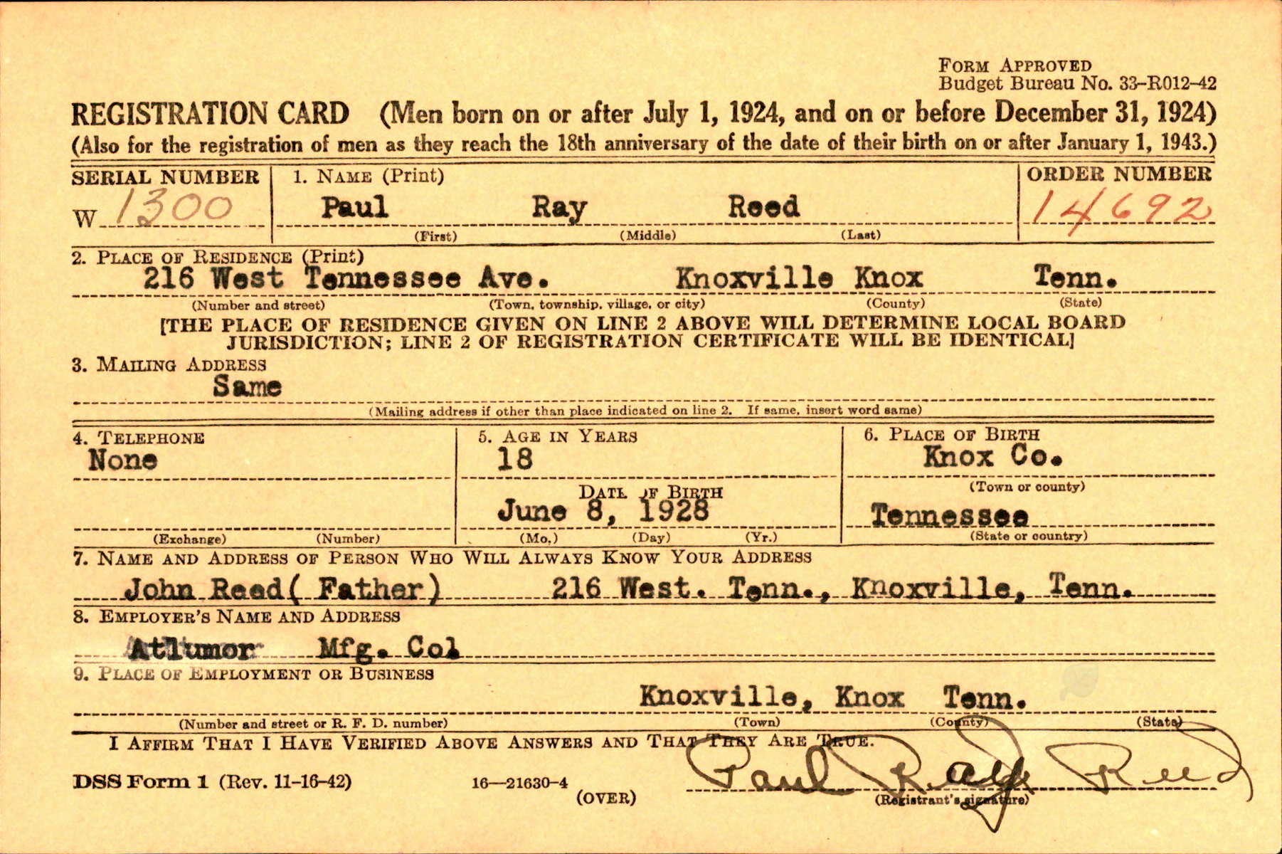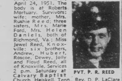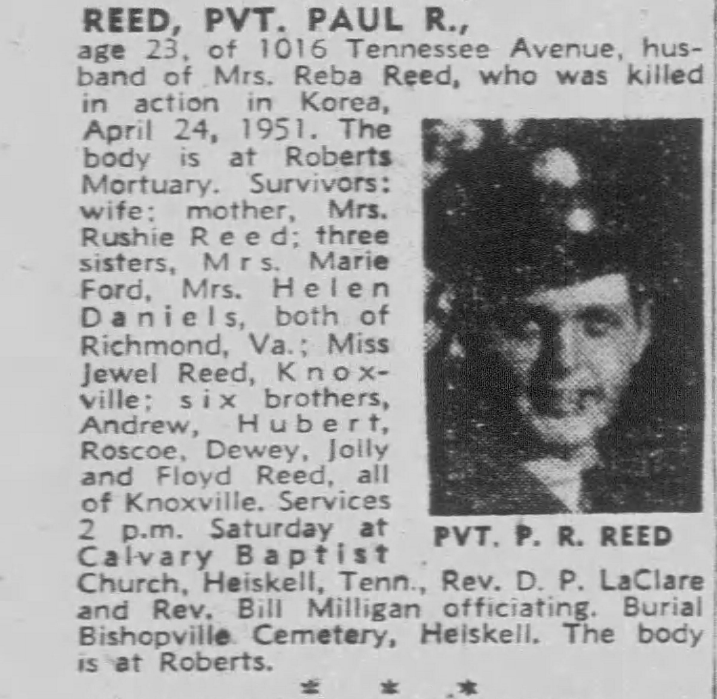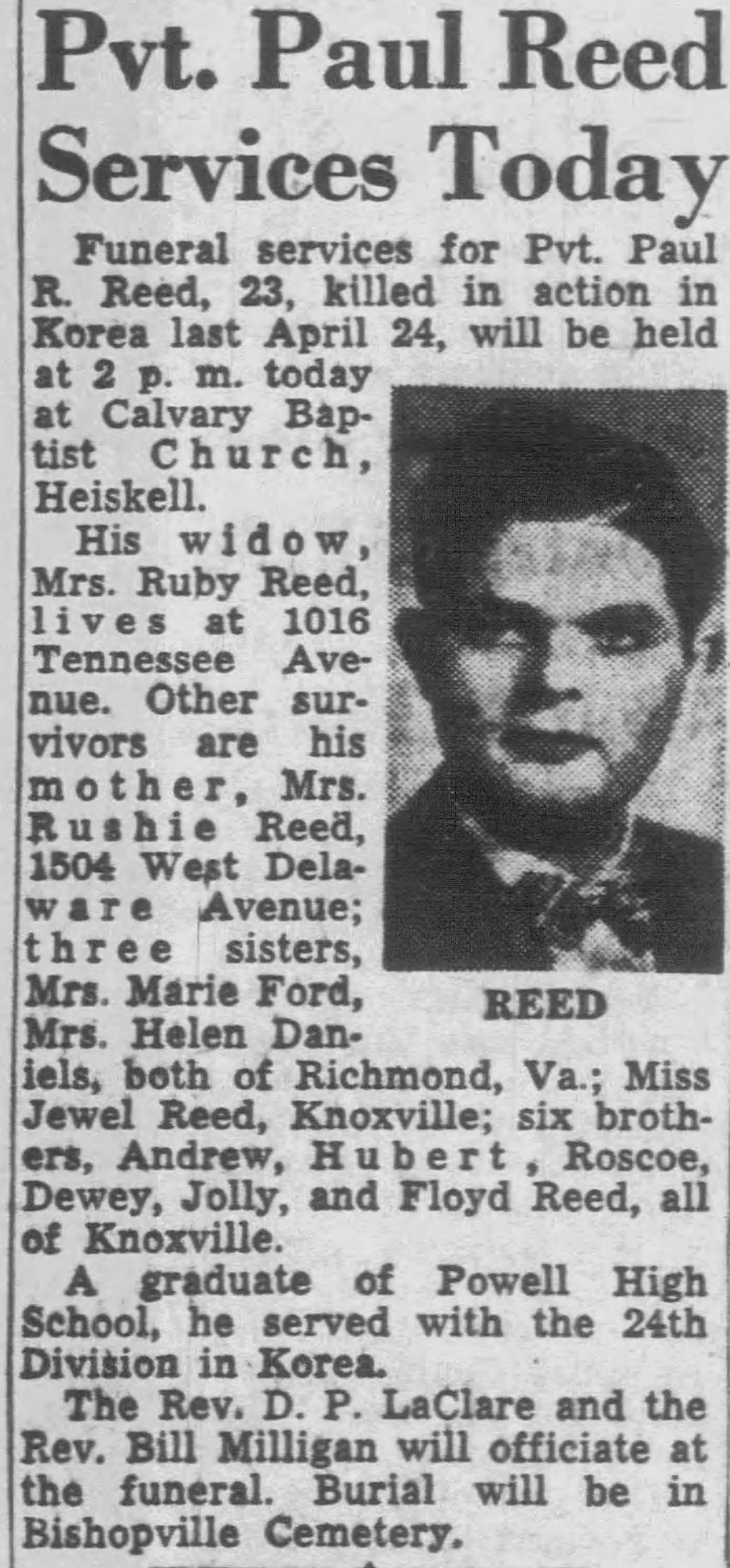 Private Paul Ray Reed was born on June 8, 1929. He was the son of John Reed and Rushie Yarnell Reed. Paul was from a large family and had six brothers Roscoe, Andrew, Jolly, Floyd, Bill, and Hubert Reed and sisters, Jewell Reed, Helen Reed Daniels, and Marie Reed Ford. He was married to his wife, Reba Goin Reed. Paul was a graduate of Powell High School, member of Calvary Baptist Church in Raccoon Valley, and was an employee of Cherokee Spinning Company of Knoxville. He had worked at the spinning plant for several years. Reed joined the United States Army and was part of the 19th Infantry, 24th Infantry Division in Korea. Private Reed was killed in action in North Korea on April 24, 1951. He was buried at Bishopville Cemetery in the Heiskell community on October 18, 1952. Private Reed was awarded the Purple Heart, the Combat Infantrymans Badge, the Korean Service Medal, the United Nations Service Medal, the National Defense Service Medal and the Korean War Service Medal.