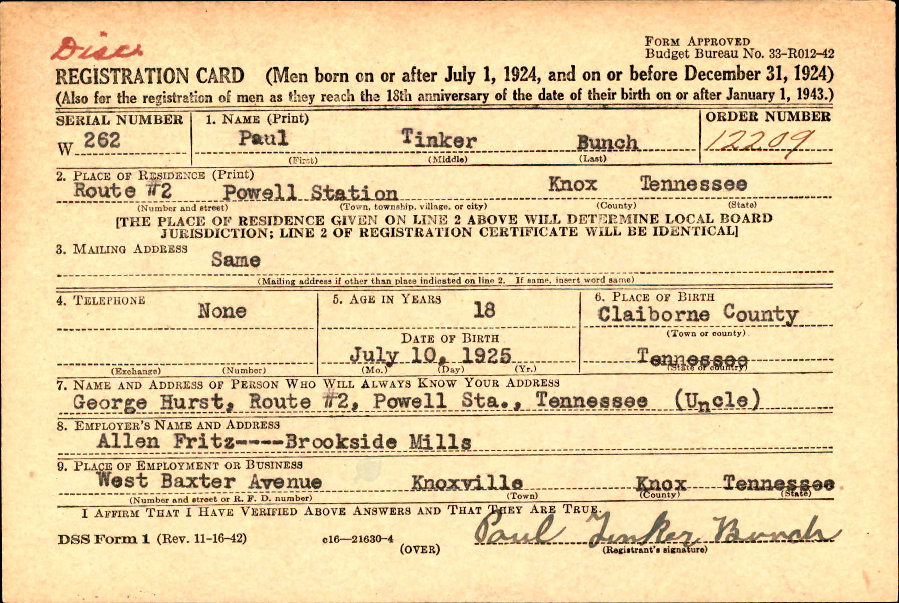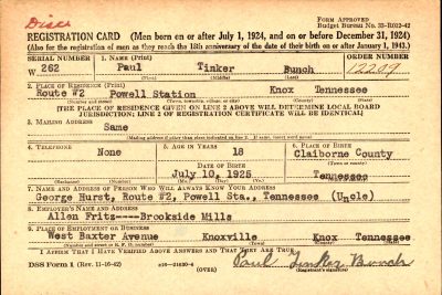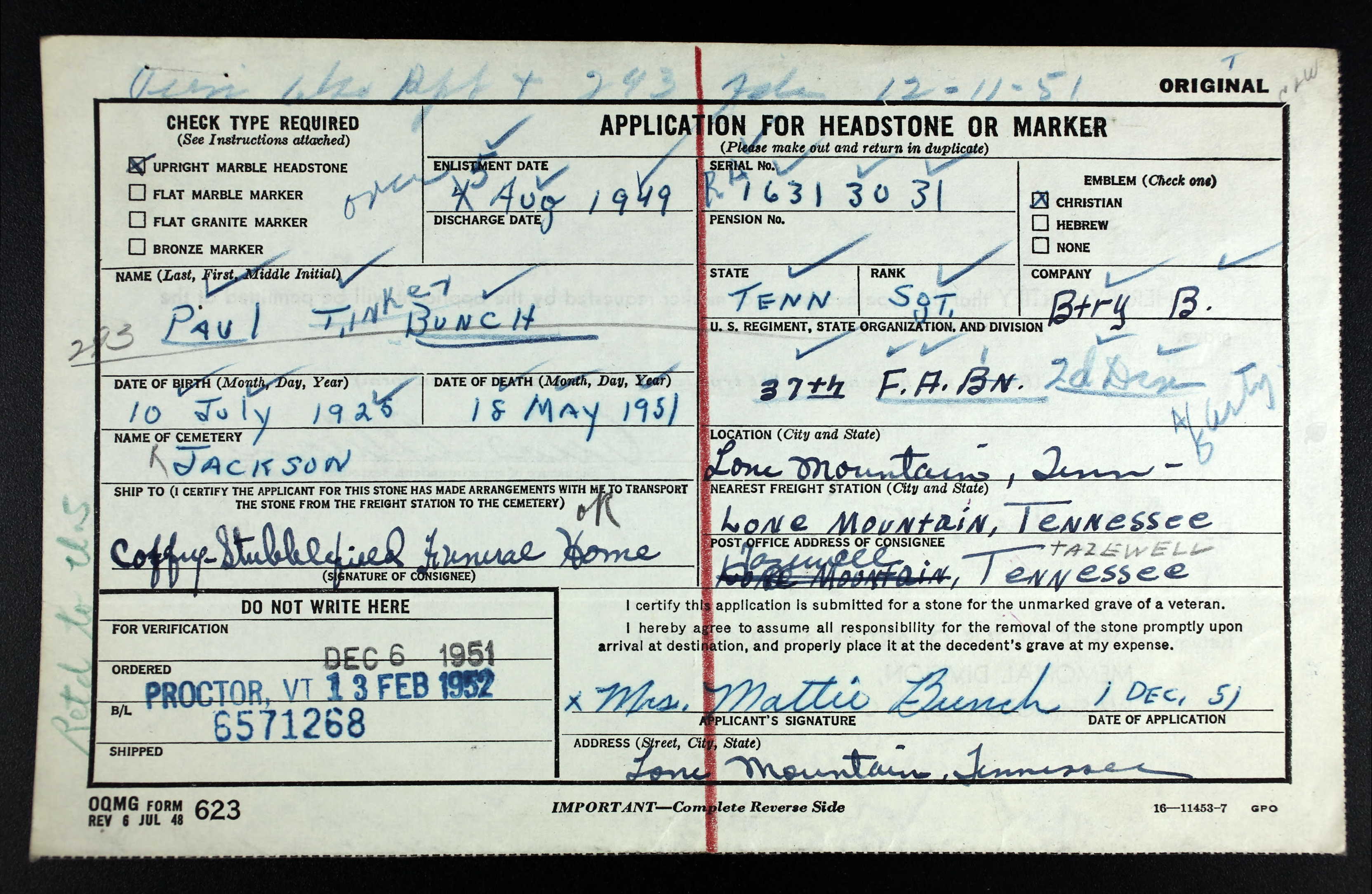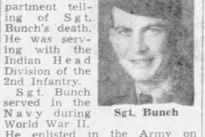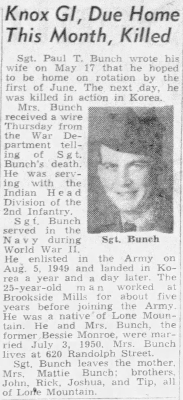 Sgt. Paul T. Bunch wrote his wife on May 17 that he hoped to be home on rotation by the first of June. The next day, he was killed in action in Korea. Mrs. Bunch received a wire Thursday from the War Department telling of Sgt. Bunch’s death. He was serving with the Indian Head Division of the 2nd Infantry. Sgt.Bunch served in the Navy during World War II. He enlisted in the Army on Aug. 5m 1949 and landed in Korea a year and a day later. The 25-year-old man worked at Brookside Mills for about five years before joining the Army. He was a native of Lone Mountain. He and Mrs. Buch, the former Bessie Monroe, were married July 3, 1950. Mrs. Bunch lives at 620 Randolph Street. Sgt. Bunch leaves the mother, Mrs. Mattie Bunch; brothers, John, Rick, Joshua and Tip, all of Lone Mountain.