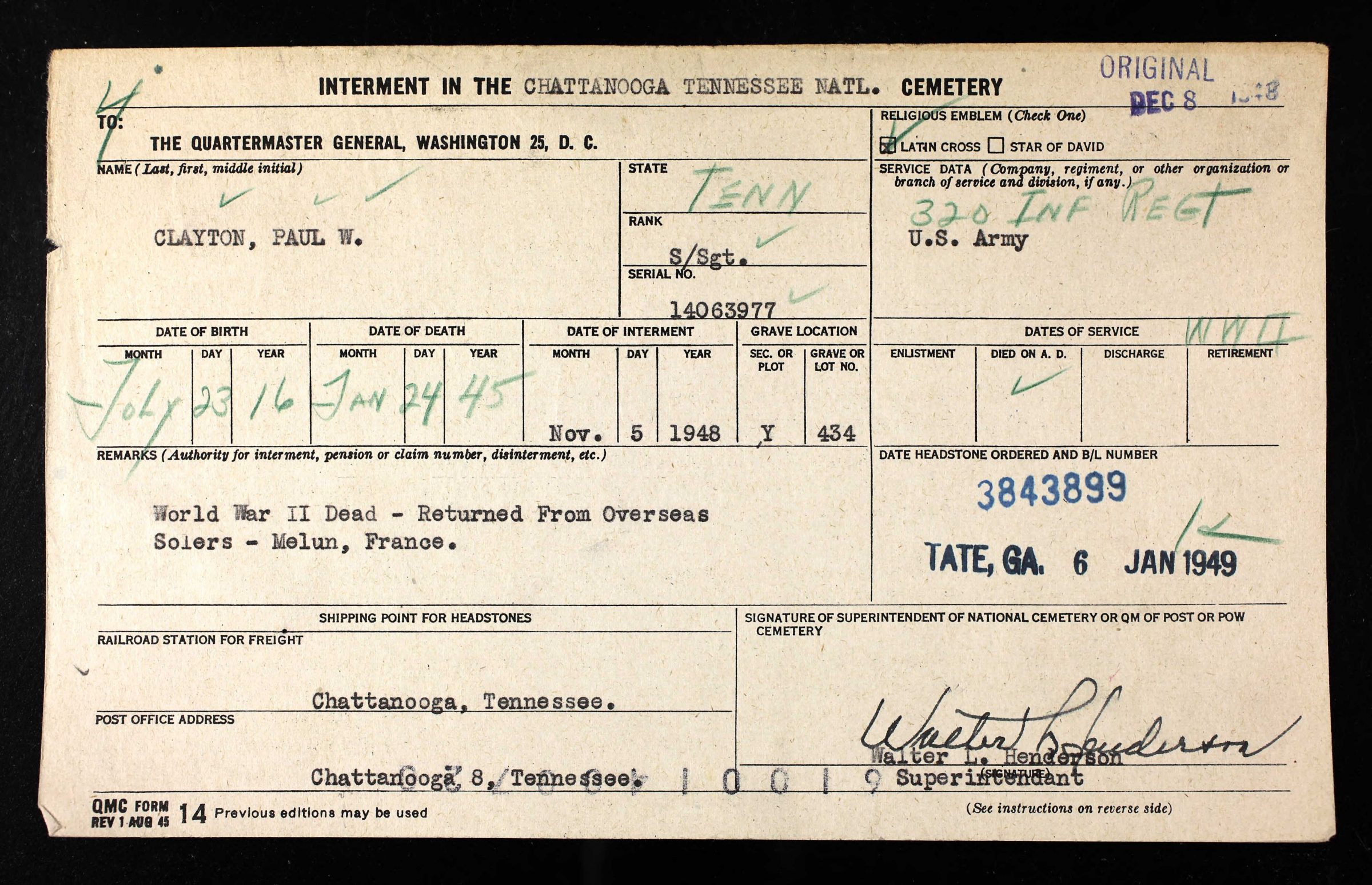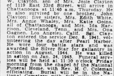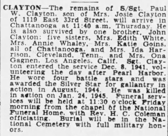 Casualties reported yesterday include S/Sgt Paul W. Clayton, 28, son of Mrs. Josie Johnson, 1119 East 33rd Street. Sgt. Clayton was killed in action with an infantry unit in France on Jan. 24. Overseas almost one year, he was employed by the Peerless Woolen Mill before entering the army in December, 1941. He was a brother of Mrs. Edith Vaughn, Mrs. Annie Whaley, Mrs. Katie Goins, Mrs. Anna Wagnon, Ida Harrison, all of Cleveland, Tenn., and John Clayton.