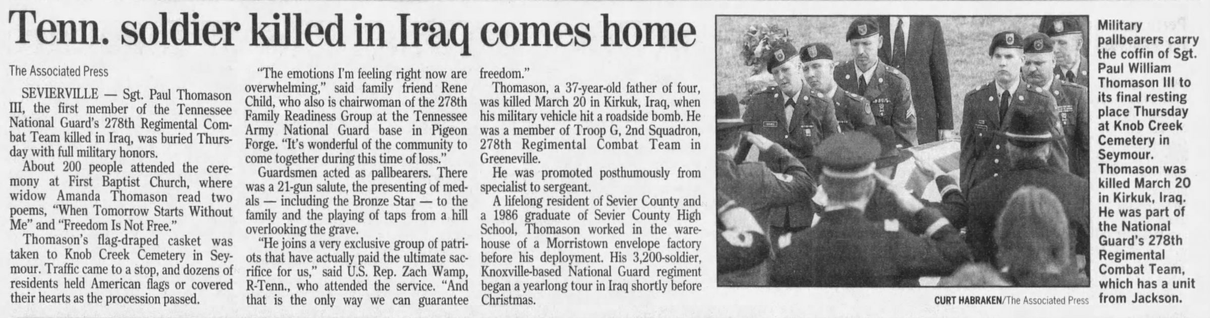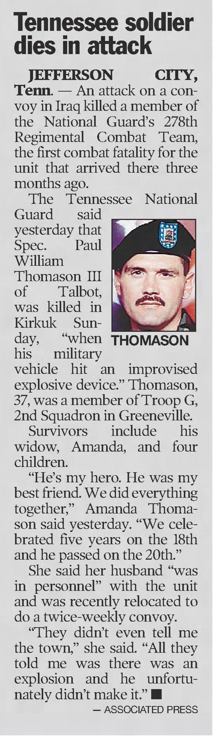 WHEREAS, one such courageous Volunteer, Sergeant Paul William Thomason III of 2nd Squadron, 278 Armored Cavalry Regiment, Tennessee Army National Guard, lost his life on March 20, 2005, in pursuit of freedom and democracy for the people of Iraq and