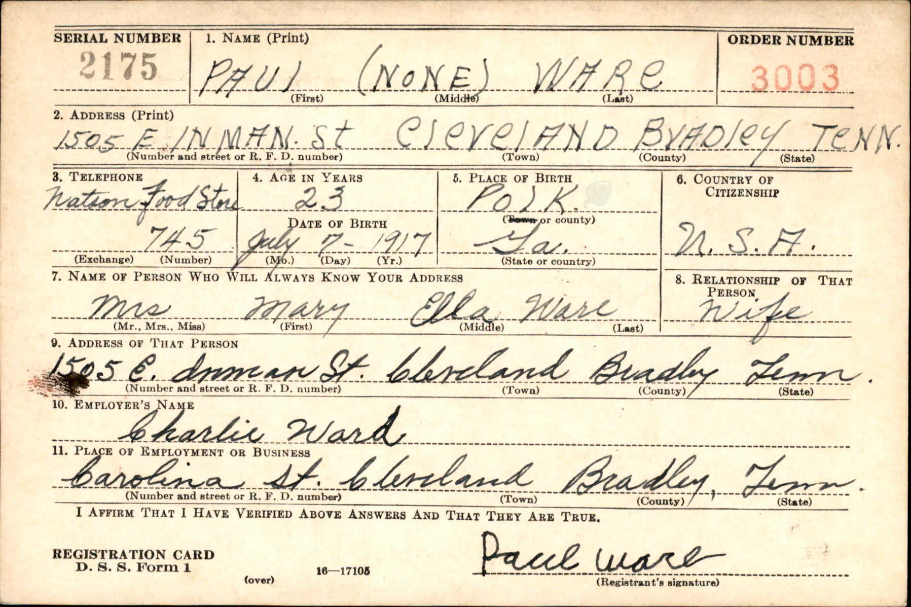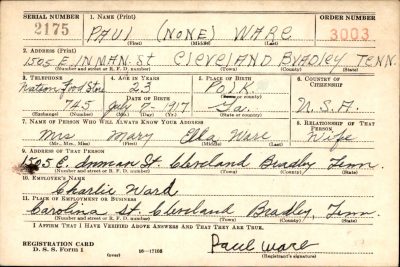 Paul Ware was born in Polk, Georgia, husband of Mary Ella Mace