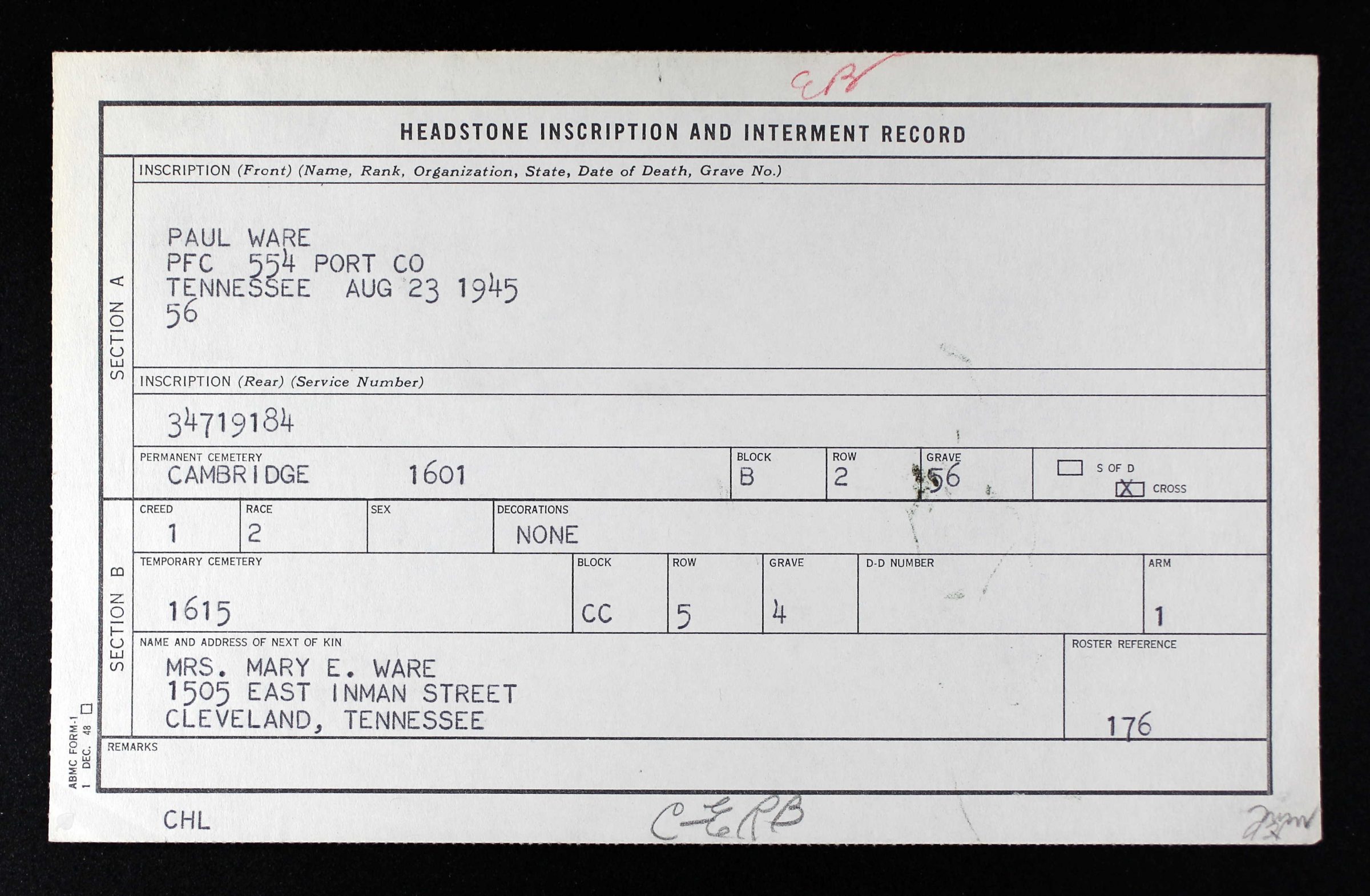 Buried at Cambridge American Cemetery, Cambridge, England, B, 2, 56