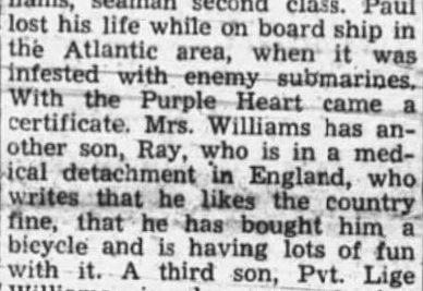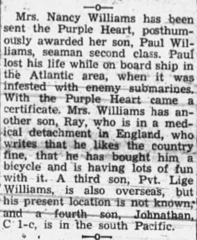 Mrs. Nancy Williams has been sent the Purple Heart, posthumously awarded her son, Paul Williams, seaman second class. Paul lost his life while on board ship in the Atlantic area, when it was infested with enemy submarines. With the Purple Heart came a certificate. Mrs. Williams has a other son, Ray, who is in a medical detachment in England, who writes that he likes the country fine, that he has bought him a bicycle and is having lots of fun with it. A third son, Lige Williams, is also overseas, but his present location is not known, and a fourth son, Johnathan, C 1-c, is in the South Pacific.