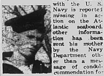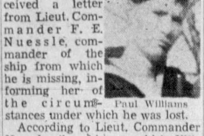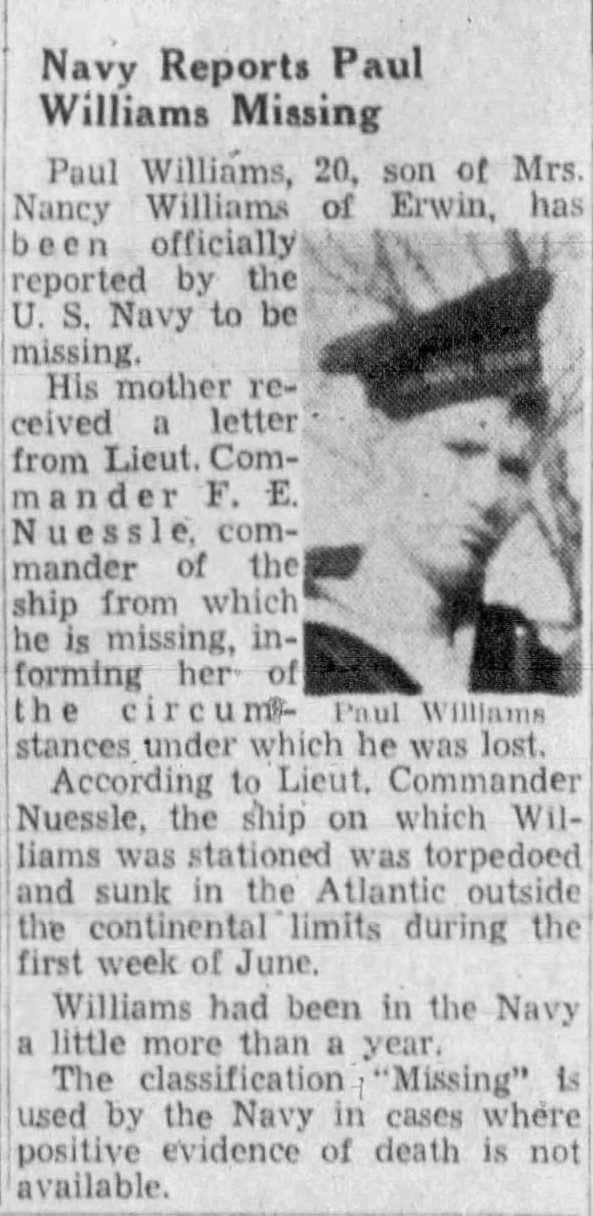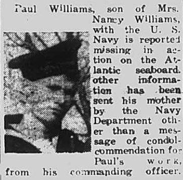 Paul Williams, son of Mrs. Nancy Williams, with the U.S. Navy is reported missing in action on the Atlantic seaboard, other information has been sent his mother by the Navy Department other than a message of condol-commendation for Paul’s work, from his commanding officer.