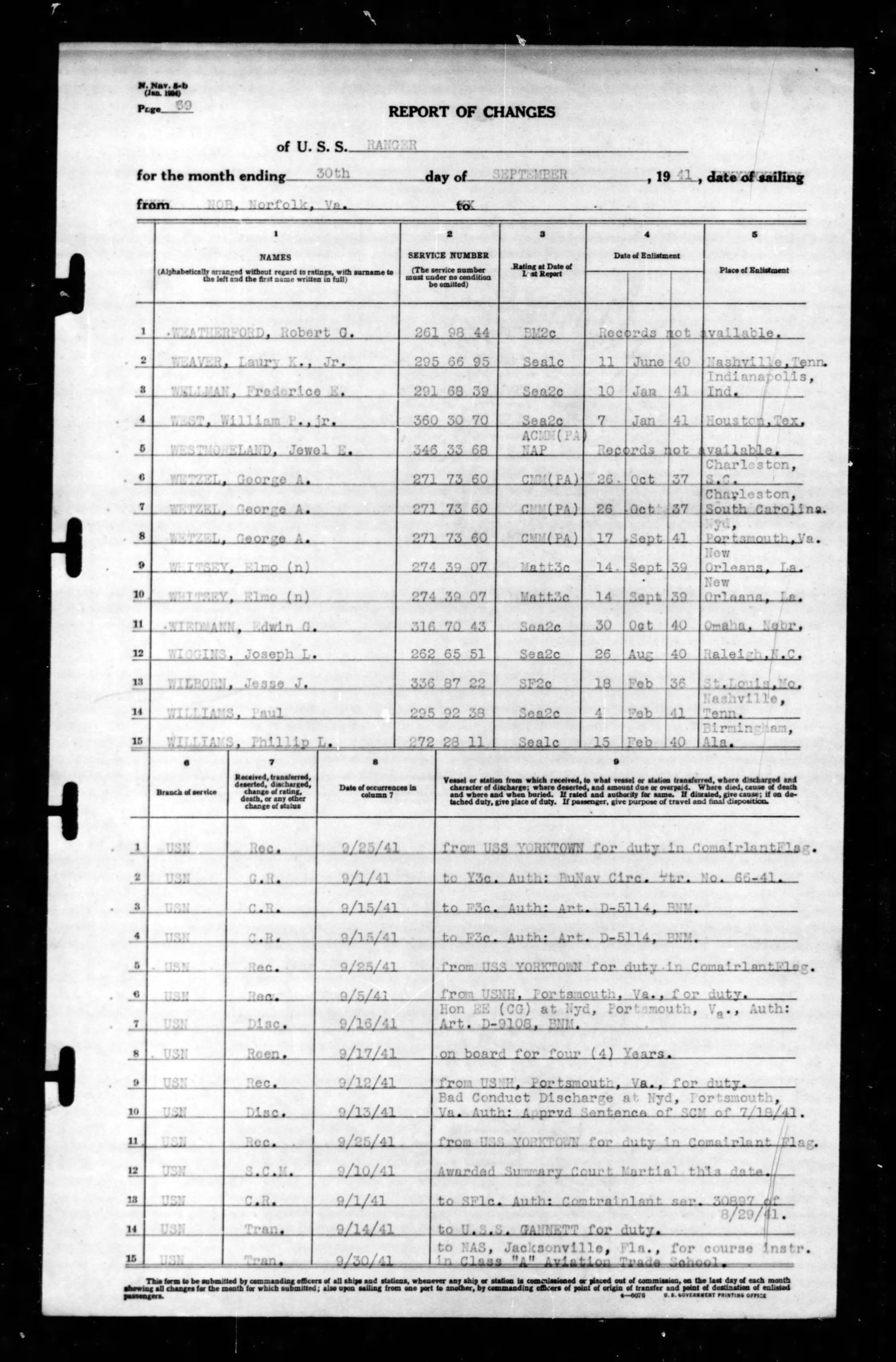 He served on the U.S.S. Ranger and was transferred to the U.S.S. Gannett for duty on 14 September 1941. He was reported missing in action on 7 June 1942 and officially declared dead on 8 June 1943.