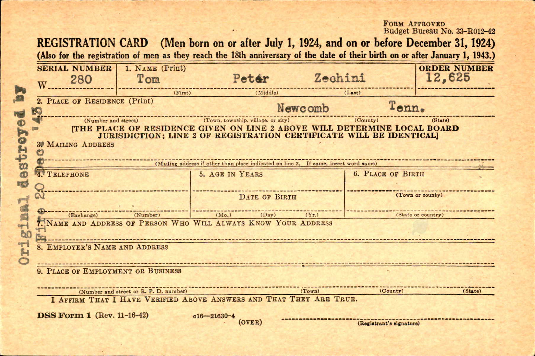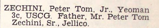 Peter Tom Zecchini was born in 1922 in Tennessee, the son of Peter and Odessa Zecchini. He had two younger brothers, John Joseph Zecchini and James Anthony Zecchini.