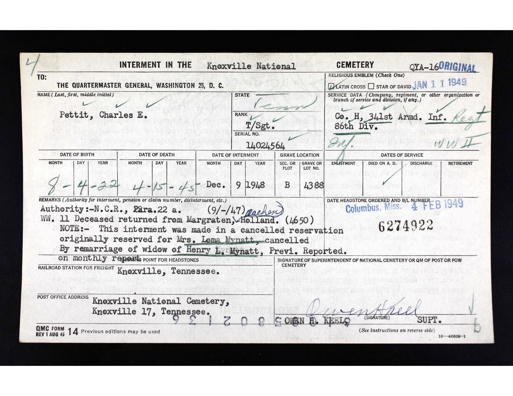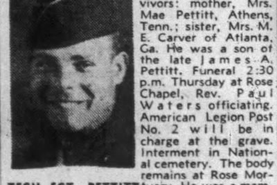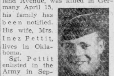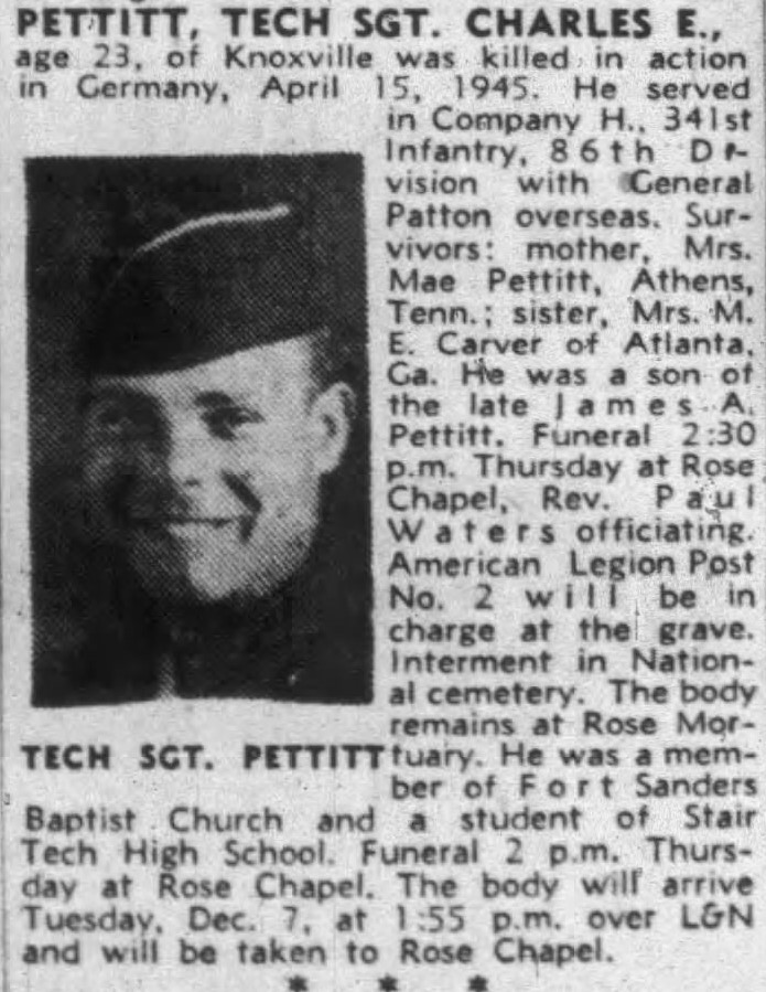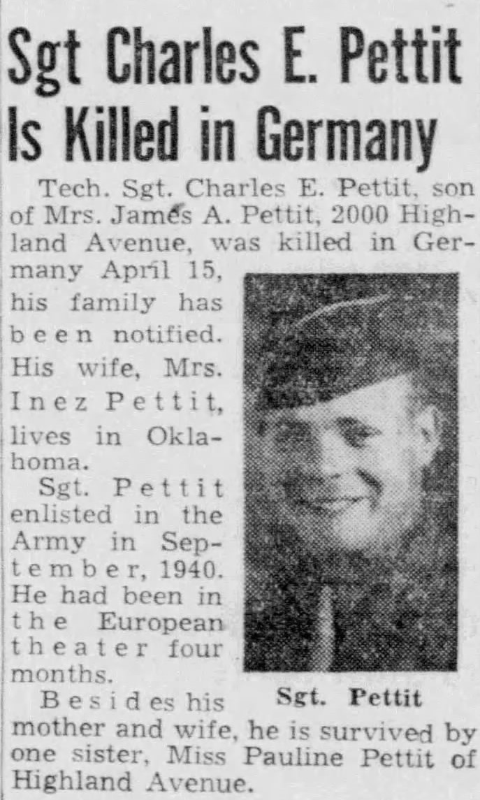 Tech. Sgt. Charles E. Pettit, son of Mrs. James A. Pettit, 2000 Highland Avenue, was killed in Germany, April 15, his family has been notified. His wife, Mrs. Inez Pettit, lives in Oklahoma. Sgt. Pettit enlisted in the Army in September, 1940. He had been in the European theater four months. Besides his mother and wife, he is survived by one sister, Miss Pauline Pettit of Highland Avenue.