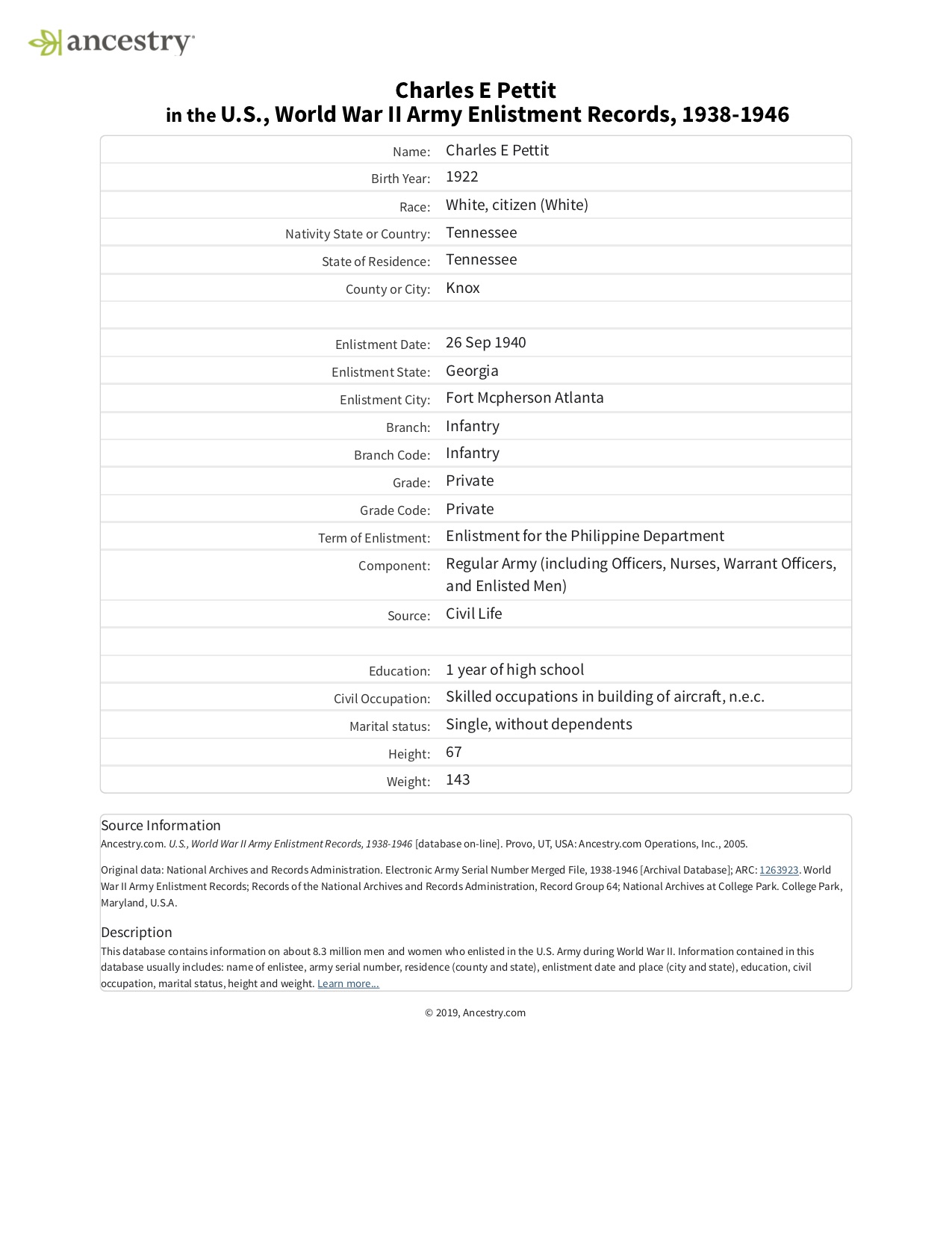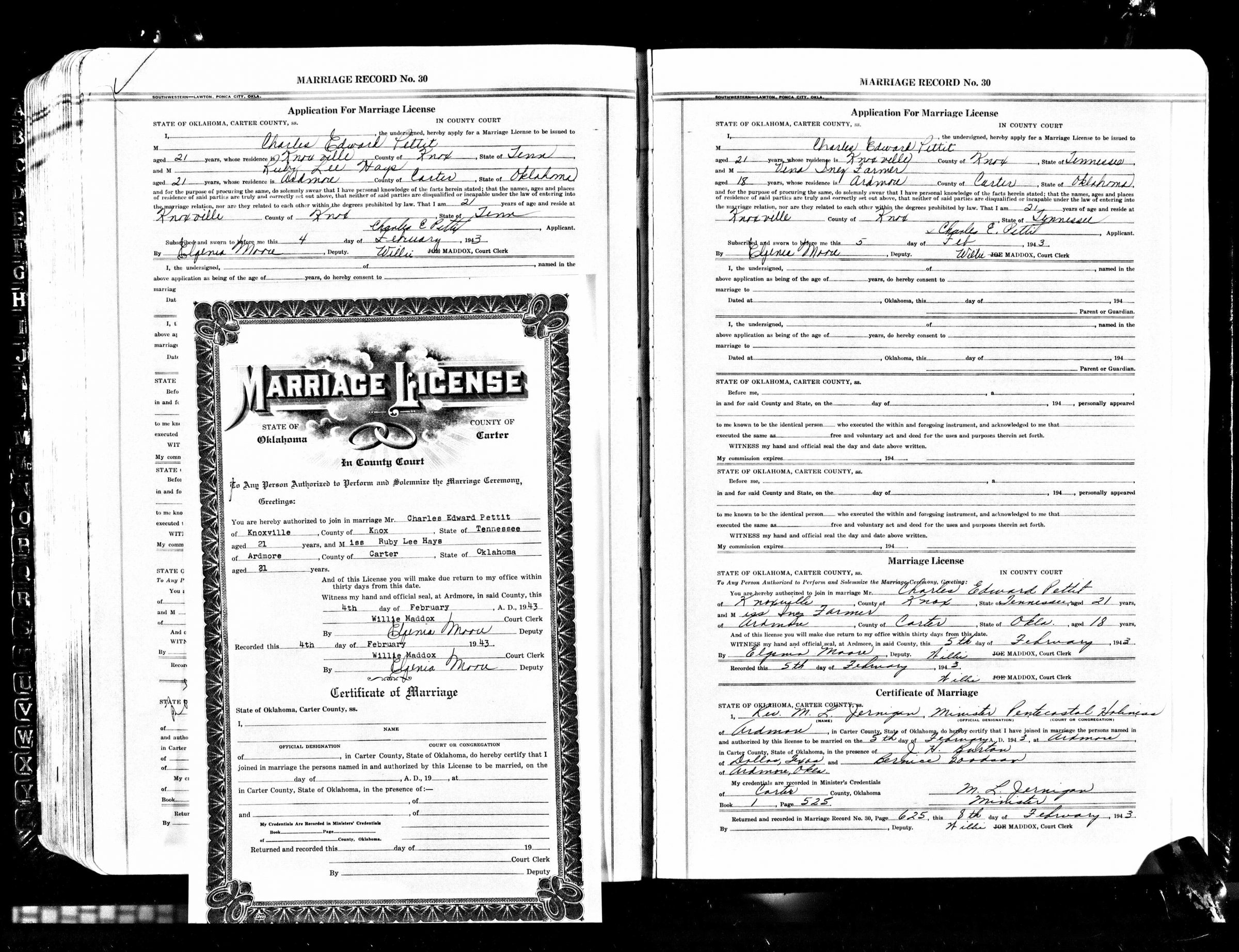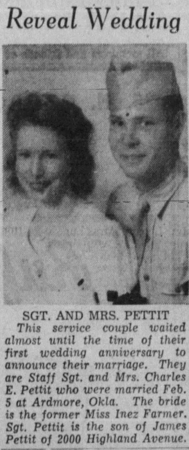 Charles Edward Pettit was the son of James A. Pettit and Gertrude May Grant. He married Inez Farmer on 5 February 1944 in Ardmore, Oklahoma.