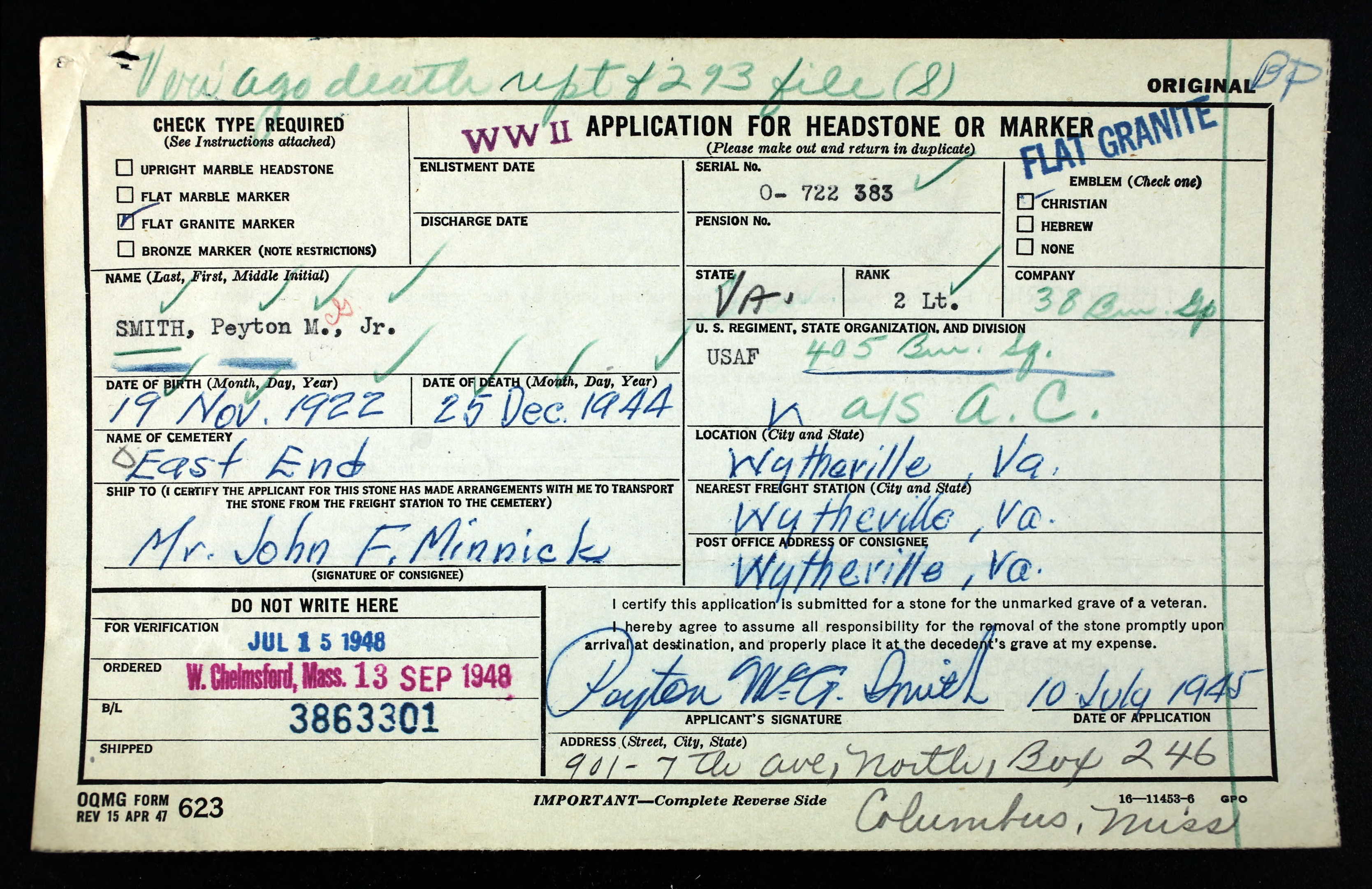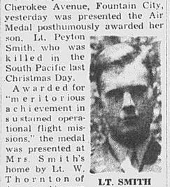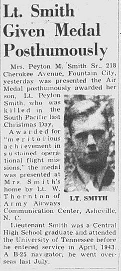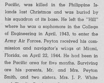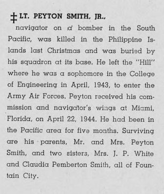 Lt. Peyton Smith Jr., navigator on a bomber in the South Pacific, was killed in the Philippine Islands last Christmas and was buried by his squadron at its base. He left the “Hill” where he was a sophomore int he college of Engineering in April, 1943, to enter the Army Air Forcces. Peyton received his commission and navigator’s wings at Miami, Florida on April 22, 1944. He had been in the Pacific area for five months. Surviving are his parents, Mr. and Mrs. Peyton Smith, and two sisters, Mrs. J.P. White and Claudia Pemberton Smith, all of Fountain City.