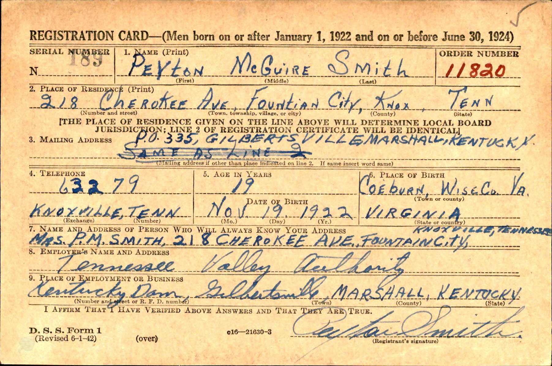 Peyton Mcguire Smith was born on 19 November 1922 in Coeburn, Virginia. He was the son of Peyton McGuire Smith and Maud Pemberton.