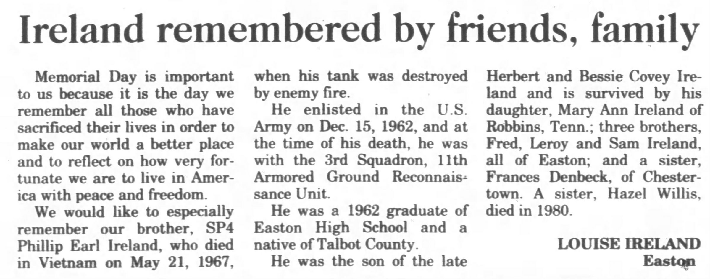 Phillip Earl Ireland was the son of Herbert Ellsworth Ireland and Bessie Covey. He was married to Bernice Mills and had a daughter Mary Ann. He was a 1962 graduate of Easton High School and enlisted in the US Army on December 15, 1962. He was killed when his tank was destroyed by enemy fire.