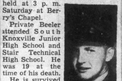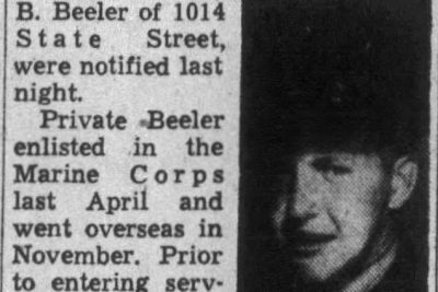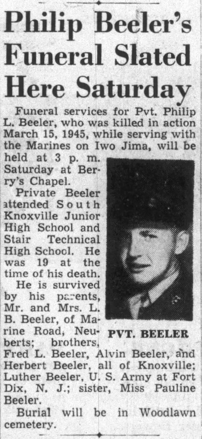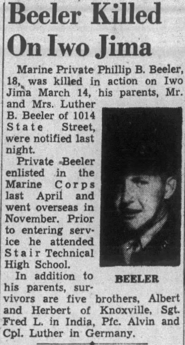 Marine Private Phillip B. Beeler, 18, was killed in action on Iwo Jima March 14, his parents, Mr. and Mrs. Luther B. Beeler of 1014 State Street, were notified last night. Private Beeler enlisted in the Marine Corps last April and went overseas in November. Prior to entering service he attended Stair Technical High School. In addition to his parents, survivors are five brothers, Albert and Herbert of Knoxville, Sgt. Fred L. in India, Pfc. Alvin and Cpl. Luther in Germany.