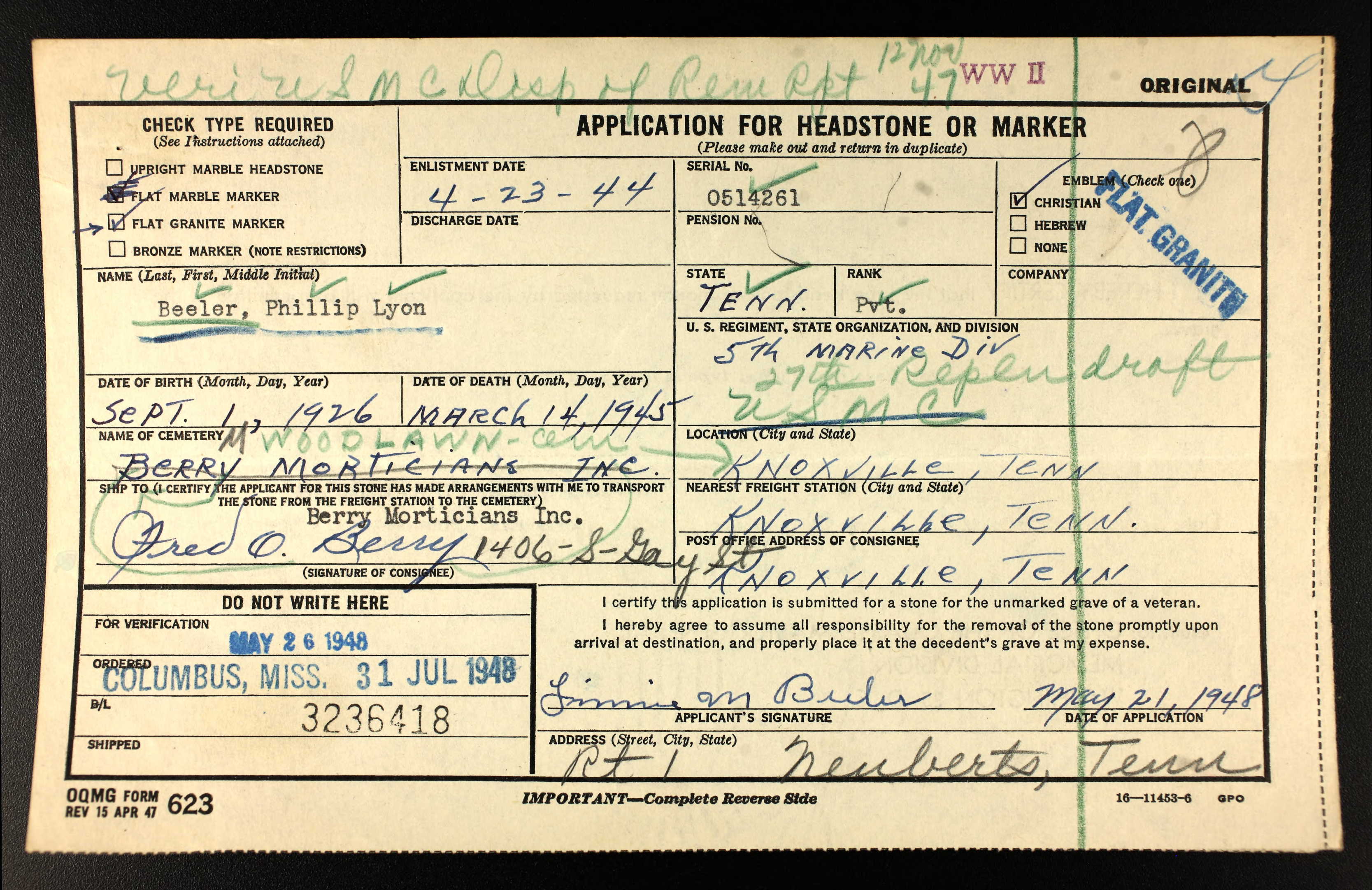 Private Phillip Lyon Beeler was killed in action in Okinawa on 14 March 1945. Prior to the war, he was attended South Knoxville Junior High School and Stair Technical High School and had joined the Marine Corp Reserve.