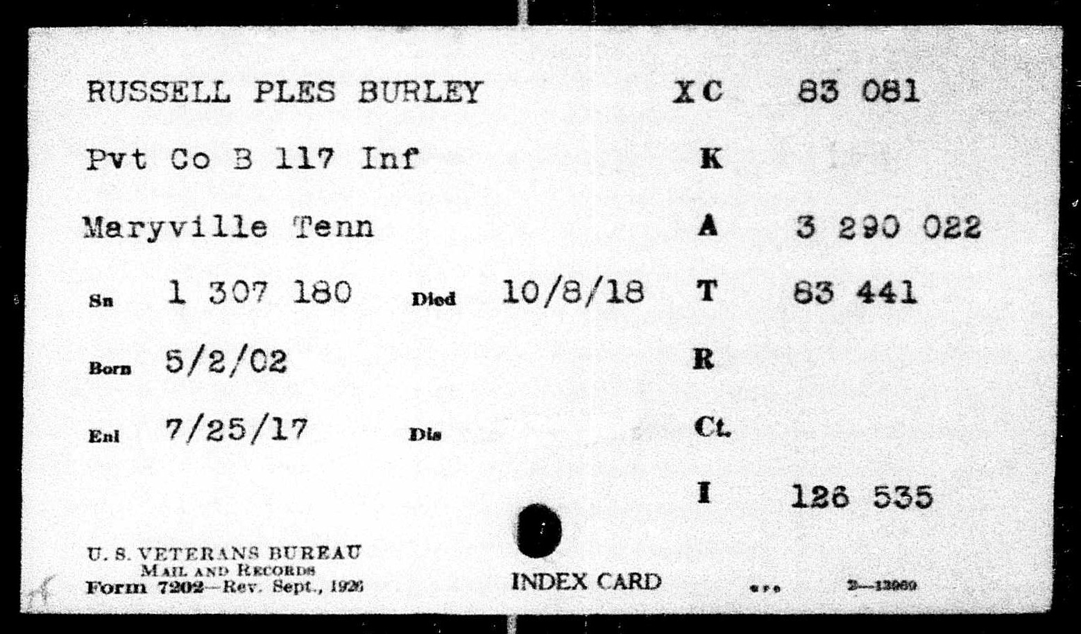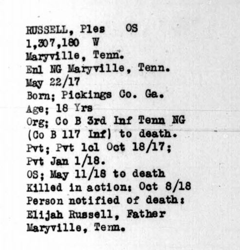 Pleas Russell, also listed as Ples Burley in state records, was born in Picking County, Georgia. He died at the age of 18.