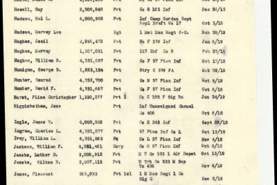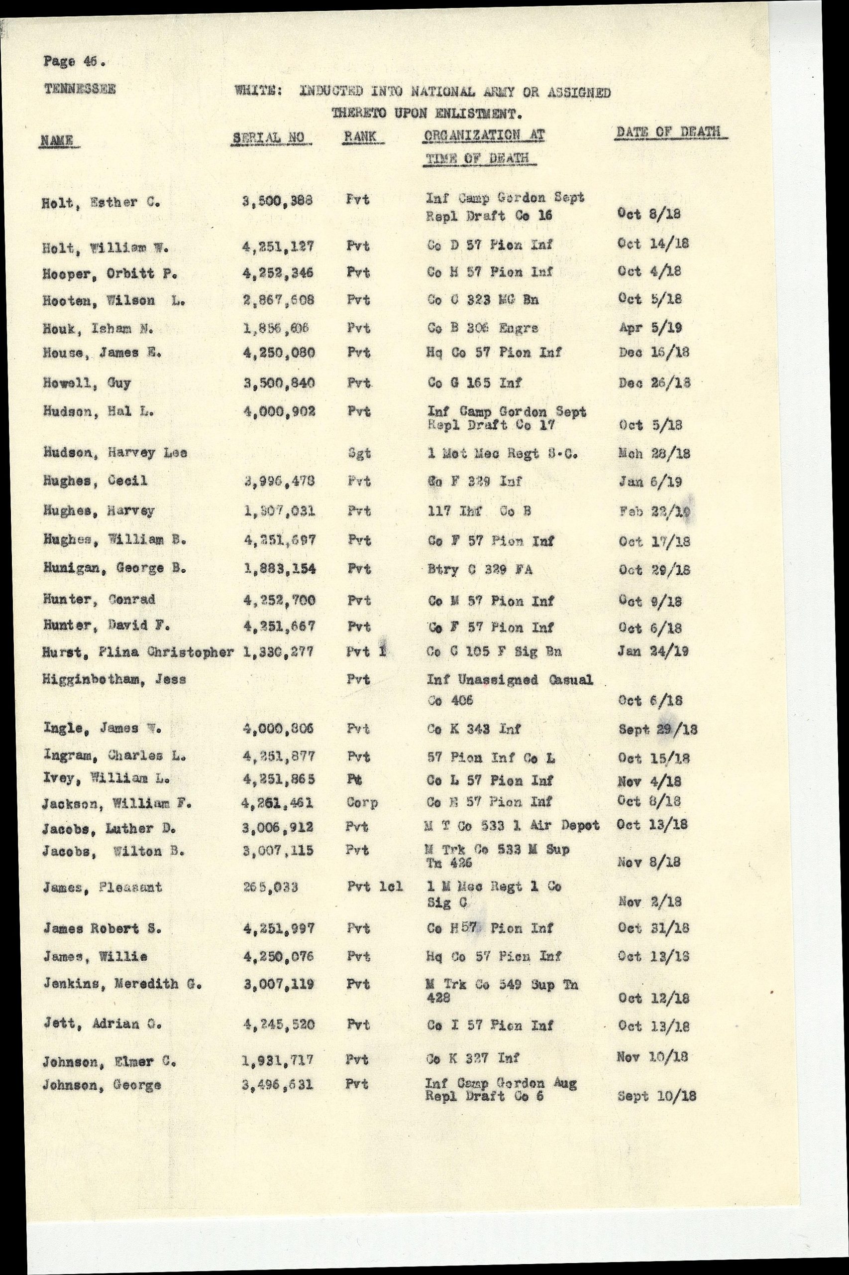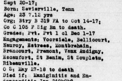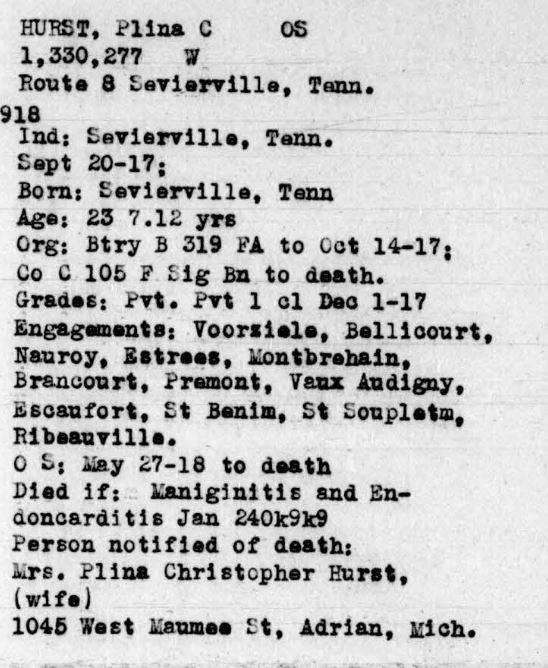 Private First Class Plina C. Hurst was born in Sevierville, Tennessee. He served in the 105th field Signal Battalion, 30th Division. He died of meningitis on 24 January 1919 and is buried at D,10,38, Oise-Aisne American Cemetery, Thiaucourt, France.
