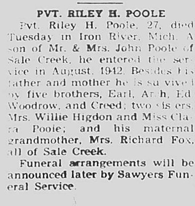 Pvt. Riley H. Poole, 27, died Tuesday in Iron River, Mich. A son of Mr. and Mrs. John Poole of Sale Creek. Besides his father and mother he is survived by five brothers, Earl, Arch, Ed, Woodrow and Creed; two sisters, Mrs. Willie Higdon and Miss Clara Poole; and his maternal grandmother, Mrs. Richard Fox, all of Sale Creek.
