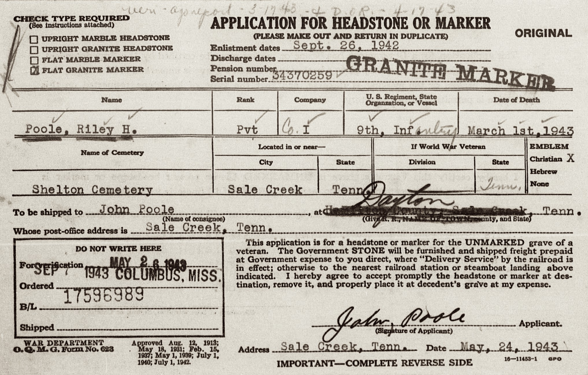 Pvt. Riley H. Poole was born on 10 September 1916 to John R. Poole and Clara J. Fox. He entered the service on 12 September 1942 at Fort Oglethorpe in Georgia and served as a Private with Company I, 9th Infantry Regiment when he died on March 1st, 1943.