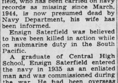 A graduate of Central High School, Ensign Saterfield entered the navy in 1935 as an enlisted man and was commissioned during the war. He had been overseas for 30 Months when reported missing. He held two citations from the navy. Mrs. Saterfield and her daughter, Jay, 3, reside at 4402 Tennessee Avenue, St. Elmo.