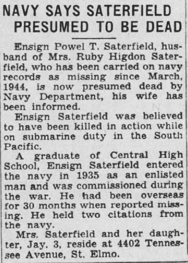 Ensign Powel T. Saterfield, husband of Mrs. Ruby Higdon Saterfield, who has been carried on navy records as missing since March, 1944, is now presumed dead by Navy Department, his wife has been informed. Ensign Saterfield was believed to have been killed in action while on submarine duty in the South Pacific.