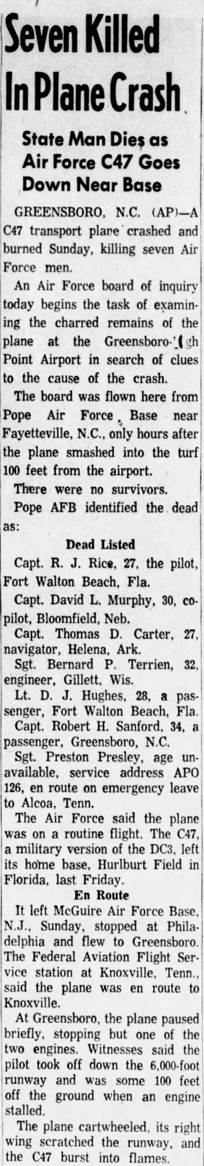 The plane was en route from McGuire AFB in New Jersey to its home field Elgin ALB in Florida. The airplane was about 100 feet off the ground after taking off at the Greensboro airport when it cartwheeled, fell to the ground and burst into flames. All 7 men aboard were killed.